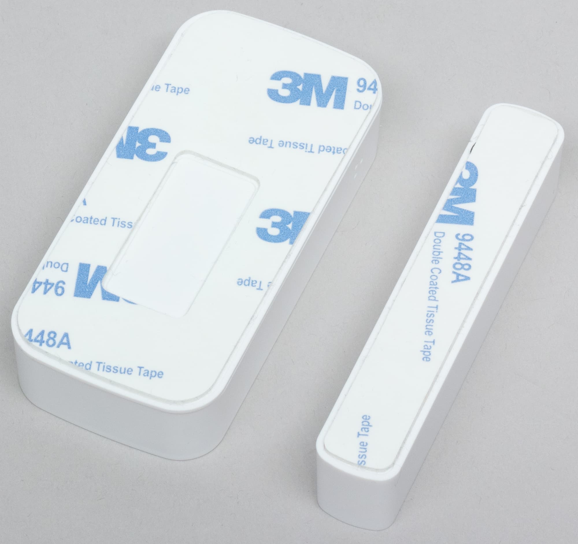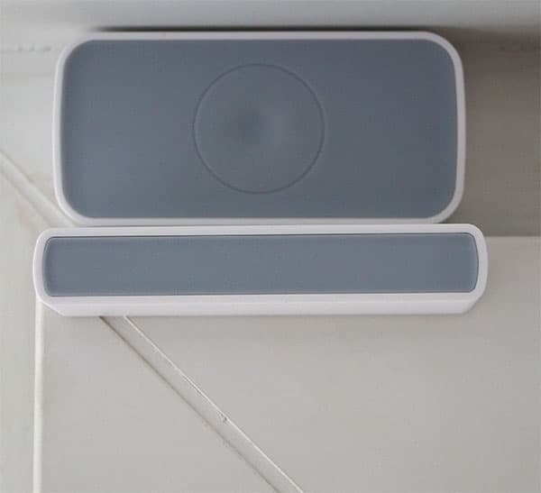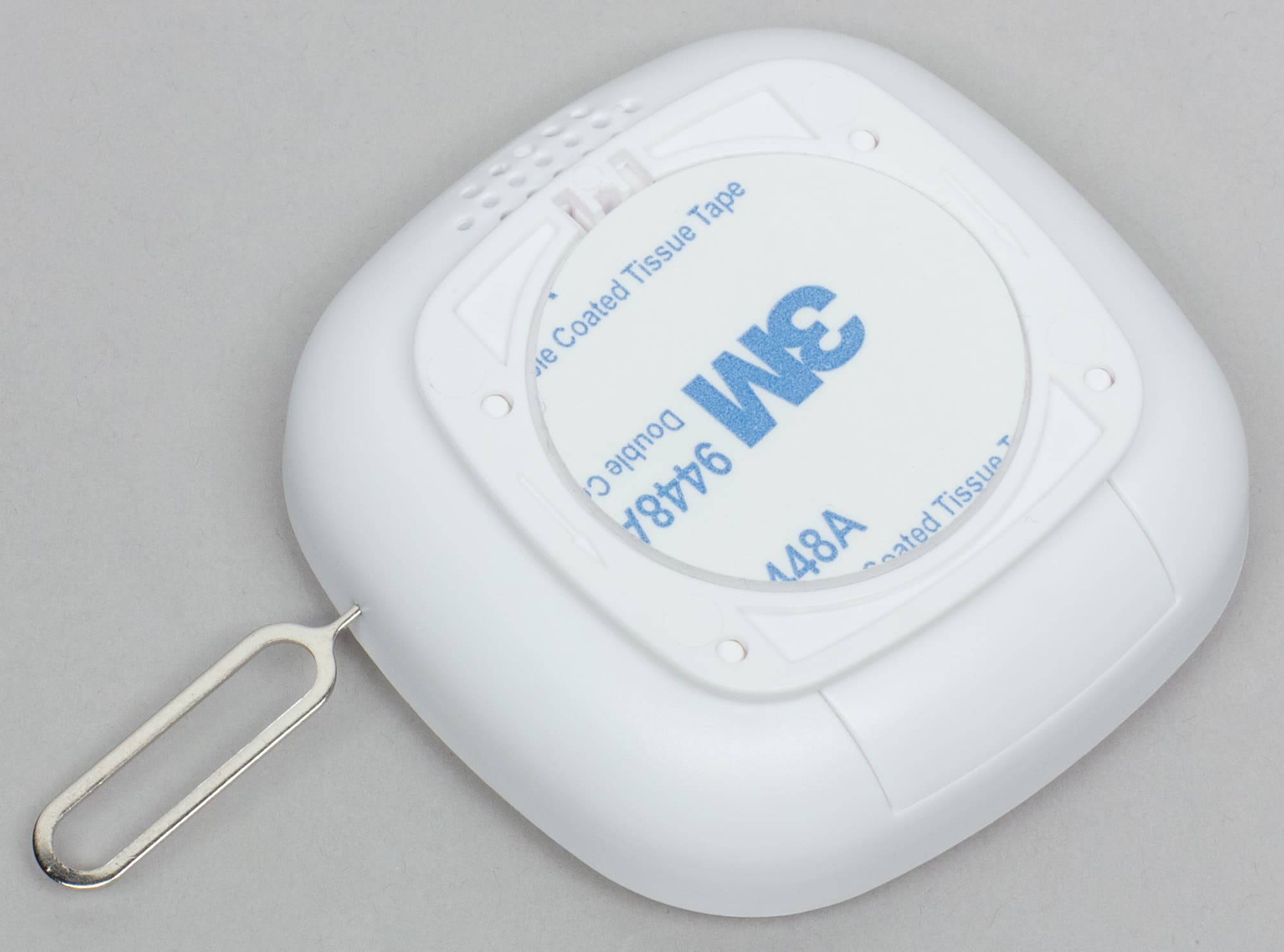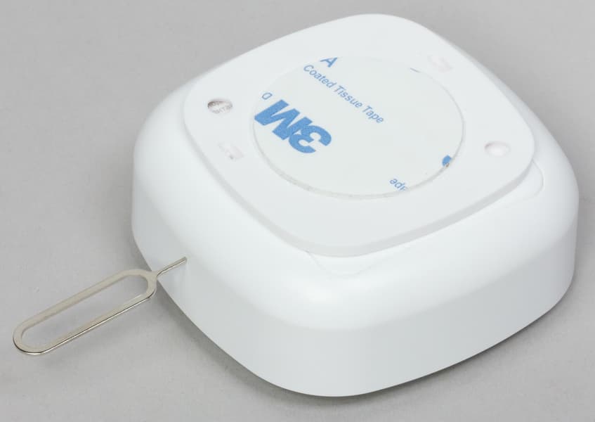 На задней стороне каждого корпуса имеется двусторонний скотч для приклеивания к поверхностям. Задняя крышка датчика играет роль крепежной площадки. Когда датчик «пристегивается» к своему креплению, внутри него нажимается особый контакт, переводящий устройство в рабочий режим. Для активации режима поиска хаба используется уже знакомая нам шпилька, которой нужно зажать скрытую в корпусе датчика кнопку.