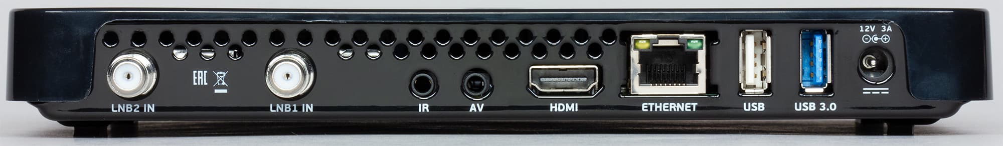 Правая боковая грань устройства содержит слот для Mini-SIM смарт-карты условного доступа, на задней же стороне приемника расположены все остальные разъемы и интерфейсы: два антенных входа, разъем для подключения внешнего инфракрасного приемника, аналоговый композитный аудио-видеовыход в формате 4-контактного джека 3,5 мм, цифровой видеовыход HDMI с поддержкой 4K, разъем LAN для включения в локальную сеть, два USB-порта версий 2.0 и 3.0 и, наконец, вход питания на 12 В.