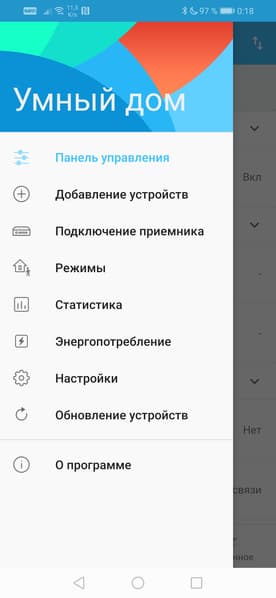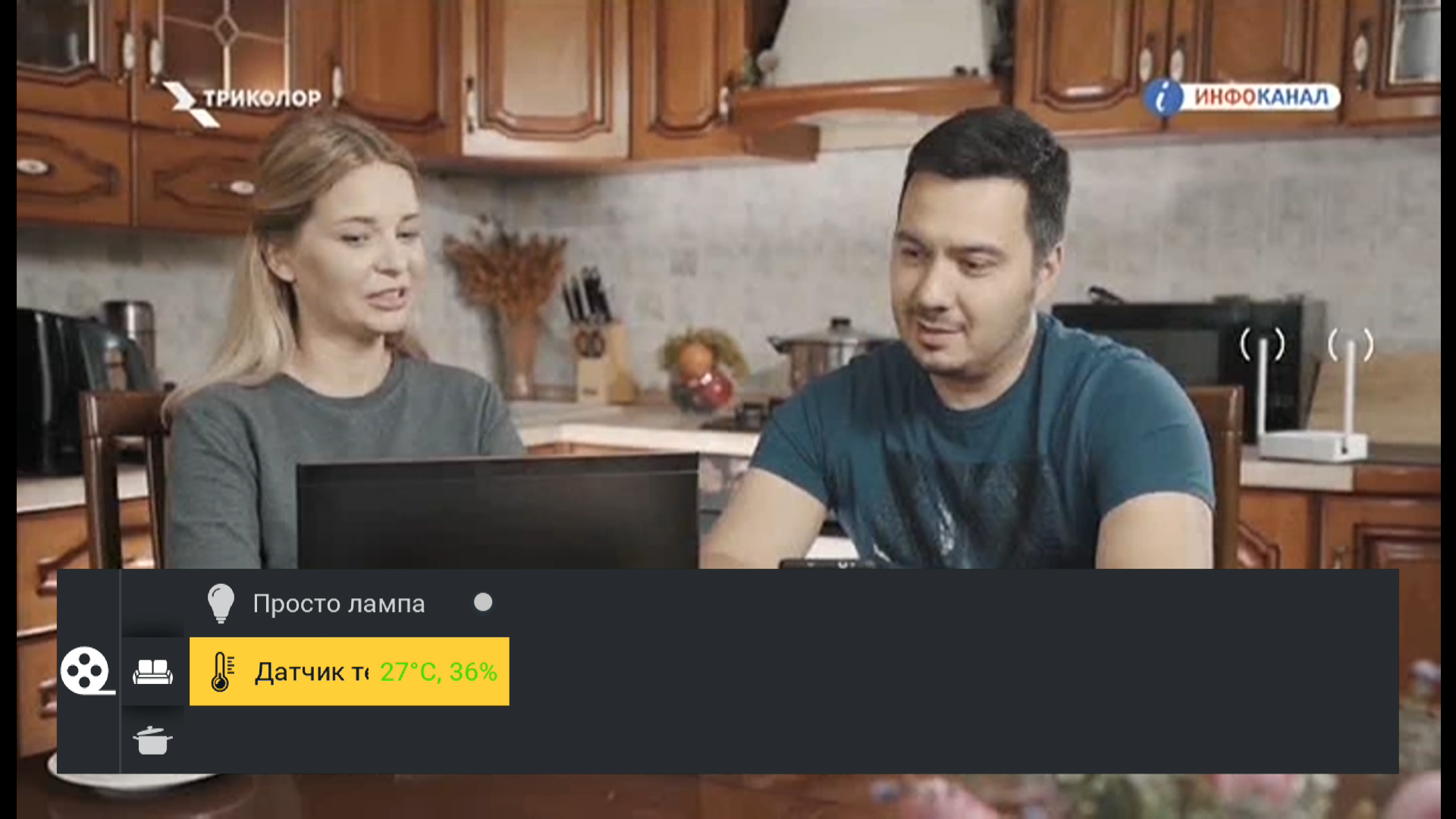 Управление работой устройств производится как через мобильное приложение (локально либо удаленно через интернет), так и непосредственно с телевизора. Здесь можно включить/выключить любую розетку, мигнуть лампочкой или изменить ее цвет и яркость, просмотреть текущее состояние приборов, узнать температуру и влажность в месте установки отвечающего за это датчика. Делать это можно в полноэкранном приложении Умный дом, либо вызвав модуль нажатием кнопки с часами на телевизионном пульте ДУ.