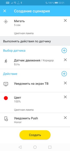 Сценарии одинаково удобно создавать как на телевизоре, так и в мобильном приложении. Понятная и логичная последовательность выбора типа событий, датчиков и устройств сопровождается доходчивыми подсказками.