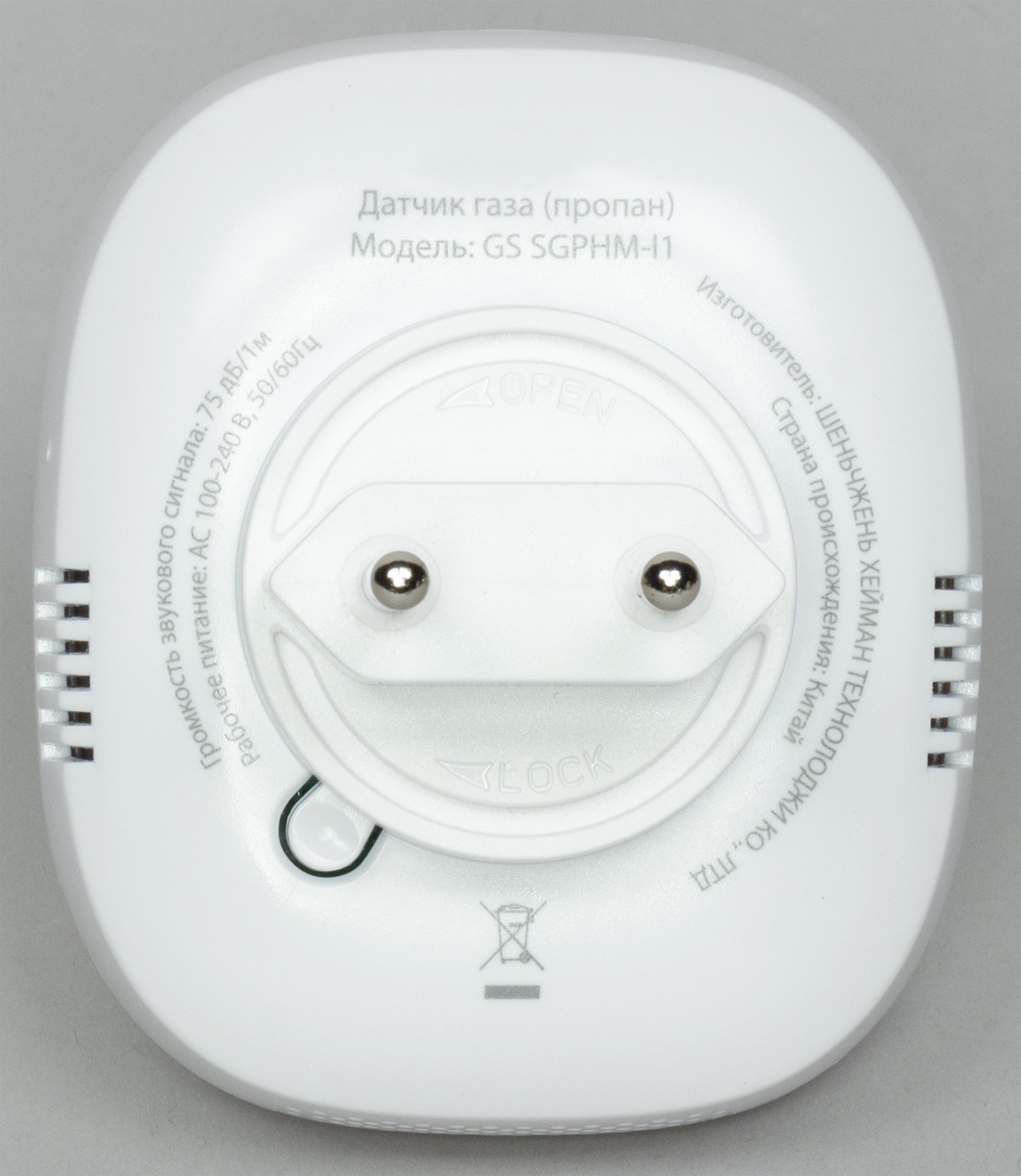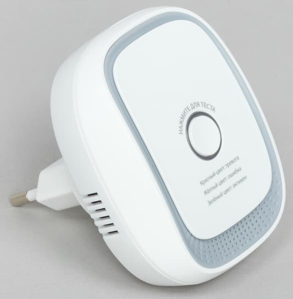 Прибор сконструирован в виде миниатюрного устройства, вставляемого в розетку. В центральной части корпуса расположена кнопка, которой тестируется состояние устройства. Забор анализируемого воздуха производится через многочисленные отверстия на передней панели. Боковые грани также имеют прорези: через них испускается режущий ухо звук сирены, если прибор определил опасную концентрацию того или иного газа. Кстати, тревогу прибор поднимет в том случае, когда определит наличие газа в концентрации в 16 раз ниже взрывоопасной (6%). Таким образом, вы будете уведомлены об угрозе задолго до достижения действительно опасной концентрации и сумеете вовремя предпринять нужные действия (оповестить газовую службу, соседей и т. д.), даже находясь далеко от дома или квартиры.
