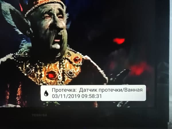 Push-оповещение о событии поступает на смартфон с небольшой задержкой, до нескольких секунд, если связь осуществляется через интернет. И мгновенно, если используется локальная связь. Так же быстро появляются сообщения на телевизоре. Они представляют собой balloon, который ненадолго всплывает поверх картинки в правом нижнем углу экрана. На следующем фотоснимке запечатлен экран телевизора в момент, когда подводный царь Чудо-Юдо сообщает о возникшей протечке. Символично.