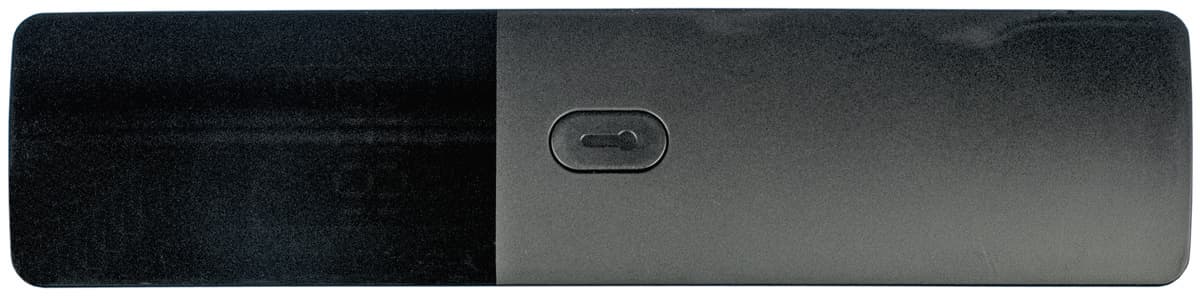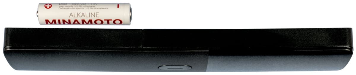 Его форма — вытянутый брусок, очень похожий на пульт ДУ от какого-нибудь бытового устройства. Это впечатление усиливается цветом: Safe T3 полностью черный. При этом нижняя и боковые поверхности, а также верхняя процентов на 60 имеют матовую фактуру, оставшаяся часть верхней плоскости, где находится индикатор, глянцевая.