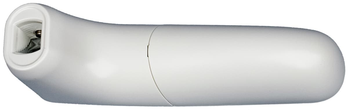 Батарейный отсек находится снизу на рукоятке и закрыт сдвижной крышкой. Управляется термометр кнопкой, расположенной ниже экрана, но ее форма не круглая, а близкая к овальной.