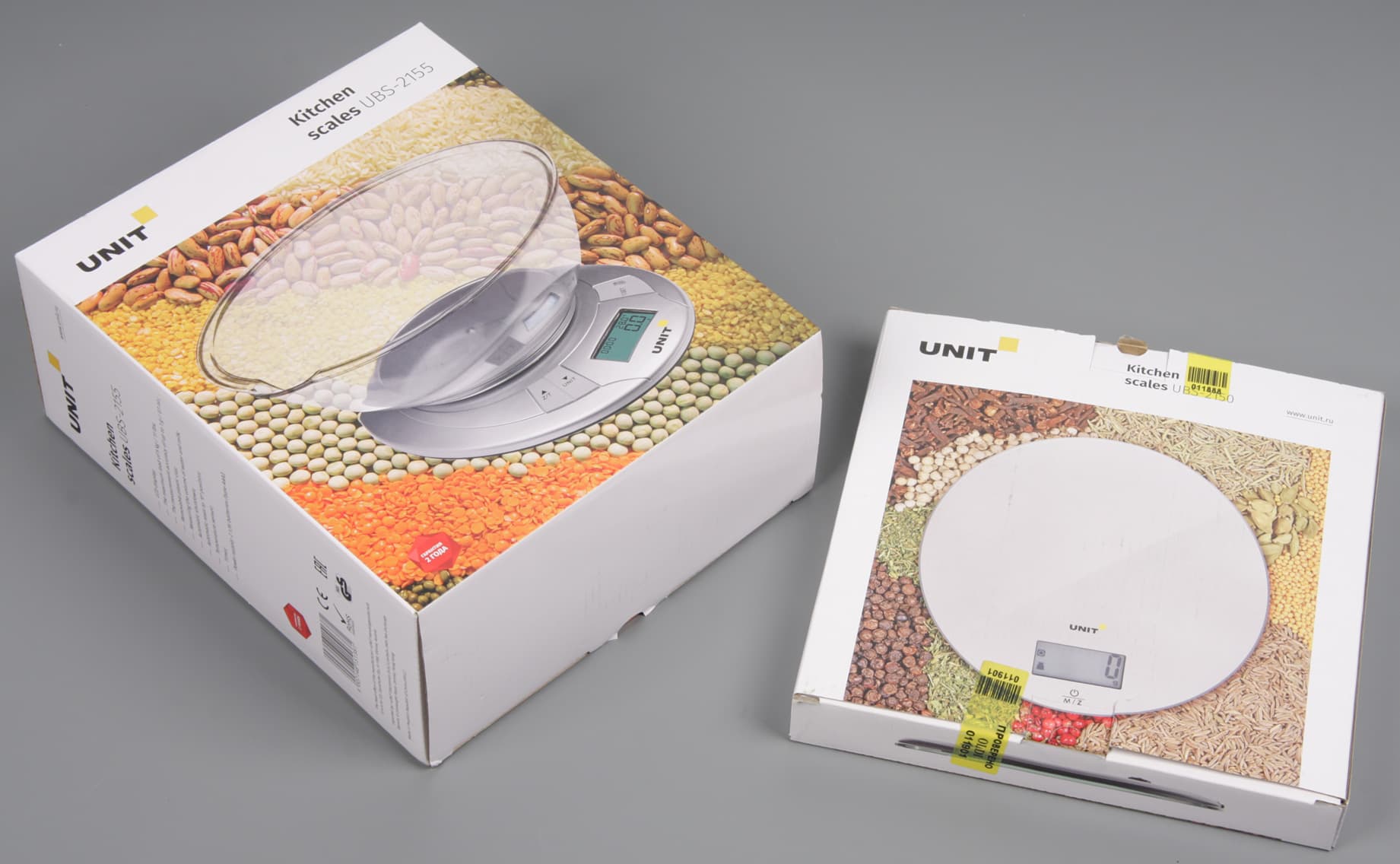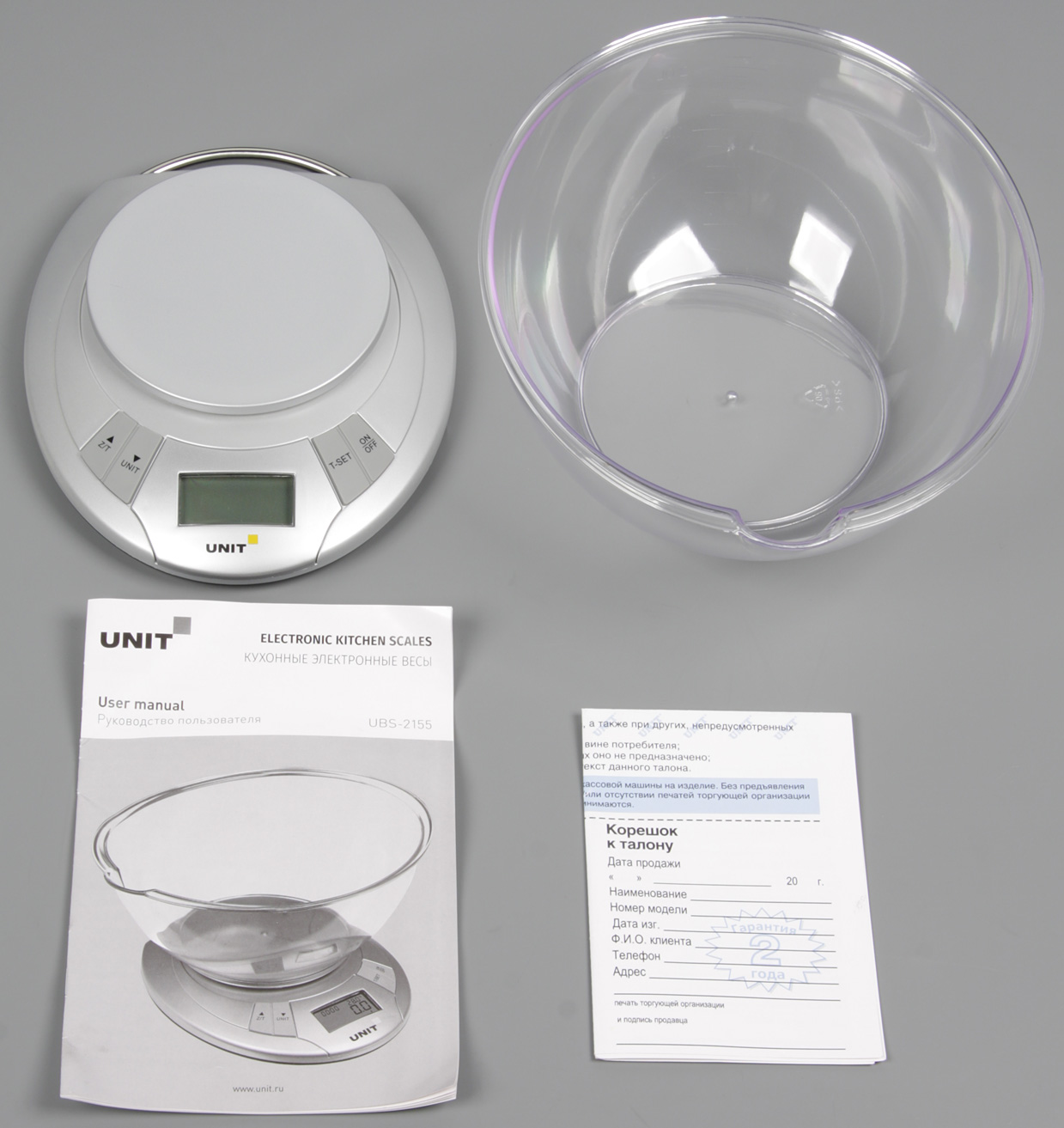 В комплект поставки входят гарантийный талон, напечатанное руководство пользователя на английском и русском языках, а в случае UBS-2155 — еще и чаша для взвешивания сыпучих и жидких продуктов.