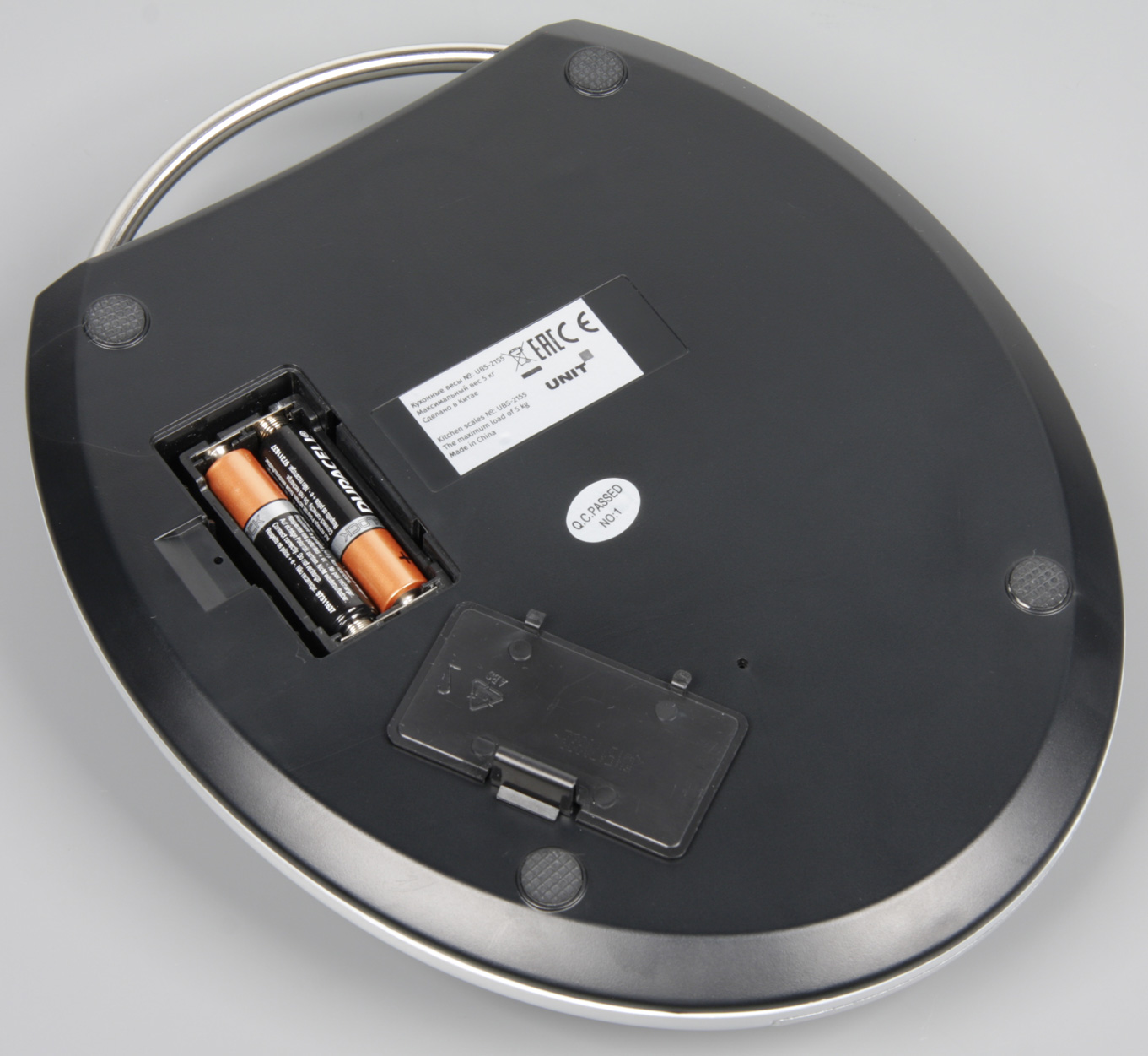 Верхняя часть корпуса весов UBS-2155, как и площадка для взвешивания, изготовлены из пластика с матовым серебристым покрытием. Площадка круглая, ее диаметр составляет 126 мм. Ширина весов — 180 мм, глубина — 222 мм, высота с ножками равна 41 мм, а весят они 378 г. Конструкция весов негерметичная, что нужно учитывать при хранении и использовании, так как попавшая внутрь вода может испортить весы.
