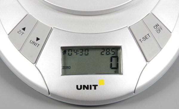 По бокам от дисплея расположены две пары механических кнопок управления. Каждая пара прикрыта своим чехлом из упругого пластика. Кнопки относительно тугие, при их срабатывании раздается громкий щелчок. Кнопка On/Off включает и выключает весы, при включении раздается писк, а выключаются весы в том числе и автоматически через 2 минуты вывода неизменных показаний. Кнопка Z/T обнуляет показания или вычитает вес тары. Эти функции работают так же, как и в случае весов UBS-2150, только на дисплей выводятся на значки, а надписи Zero или Tare, соответственно. Кнопка Unit переключает единицы измерения веса с граммов на фунты и унции и обратно. Режимов измерения объема воды и молока в данных весах нет. Зато есть таймер. Кнопкой T-Set сначала последовательно перебираются разряды минут и секунд от старших к младшим, при этом кнопками Z/T и Unit значения разрядов увеличиваются и уменьшаются, потом кнопка T-Set включает таймер. До срабатывания таймер выключается кнопкой T-Set, а после срабатывания, когда звучит прерывистый сигнал, звук выключает нажатие на любую кнопку. После срабатывания таймер сбрасывается на нулевое значение, что неудобно, когда нужно последовательно отмерять равные интервалы времени. Громкости сигнала таймера достаточно, чтобы услышать его из соседней комнаты, но закрытая дверь плюс негромкий фоновый звук таймер уже заглушают. Еще одной дополнительной функцией весов является измерение температуры окружающего воздуха.