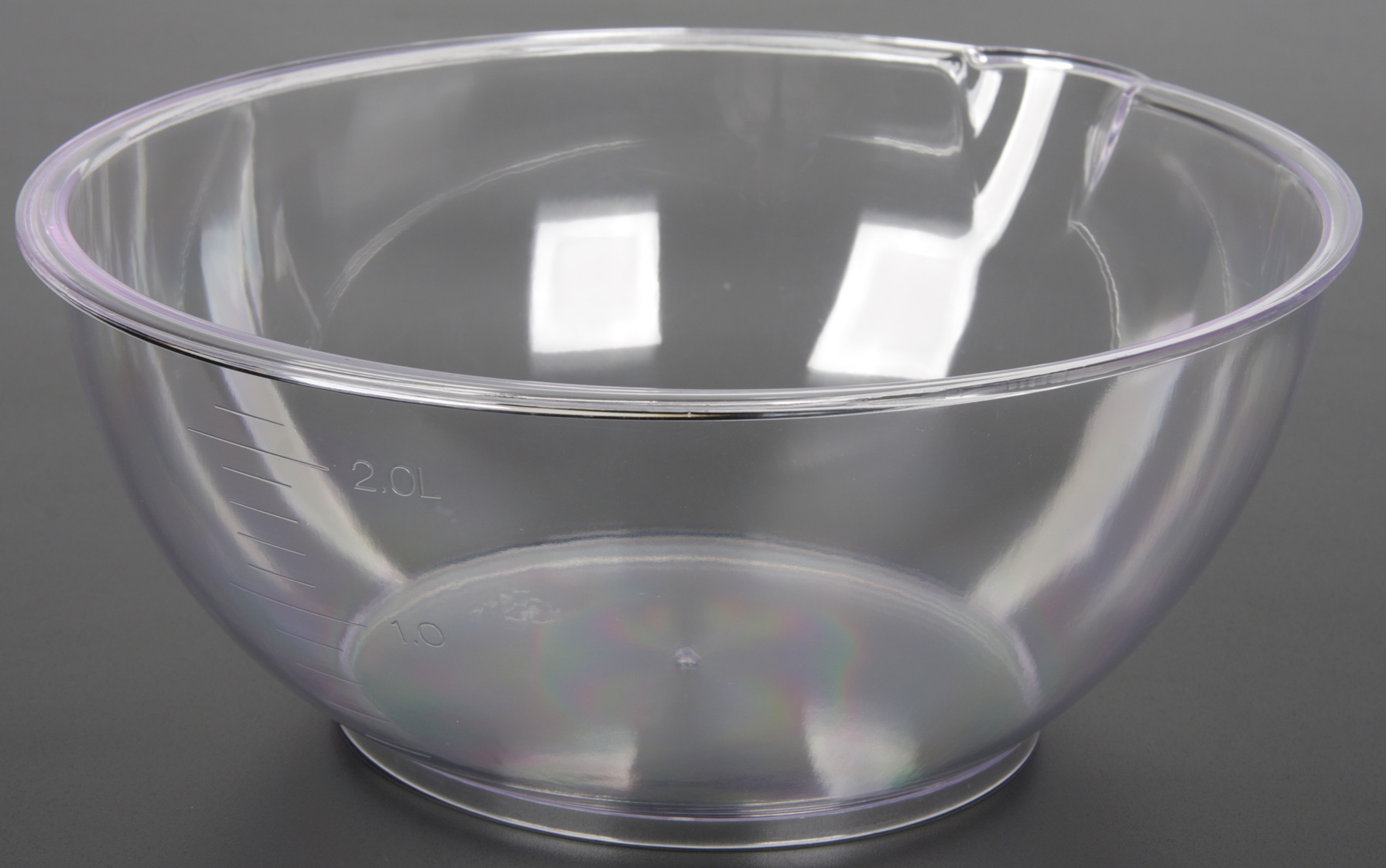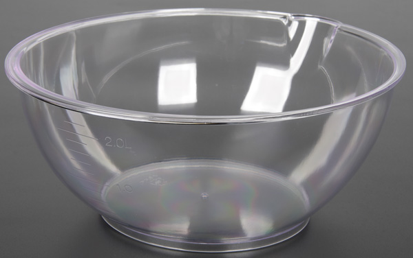 Весы UBS-2155 комплектуются чашей из прозрачного пластика (конкретнее — из полистирола). Ширина чаши — 221 мм, длина — 262 мм, высота равна 99 мм, а весит она 199 г. Объем воды, заполняющий чашу до краев составляет 2768 мл. На боковую поверхность чаши нанесены метки объема, и по крайней мере, метка 2.0 L соответствует объему в 2 л. Носик чаши позволяет отлить из нее часть объема воды так, что на внешней поверхности капли не остается.
