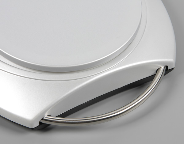В плане корпус весов представляет собой усеченный с одного узкого края эллипс. Из срезанного торца выступает дуга из металлической трубки (видимо, это нержавеющая сталь), за которую весы можно переносить, и ее же можно использовать, чтобы подвесить весы на крючок при хранении.