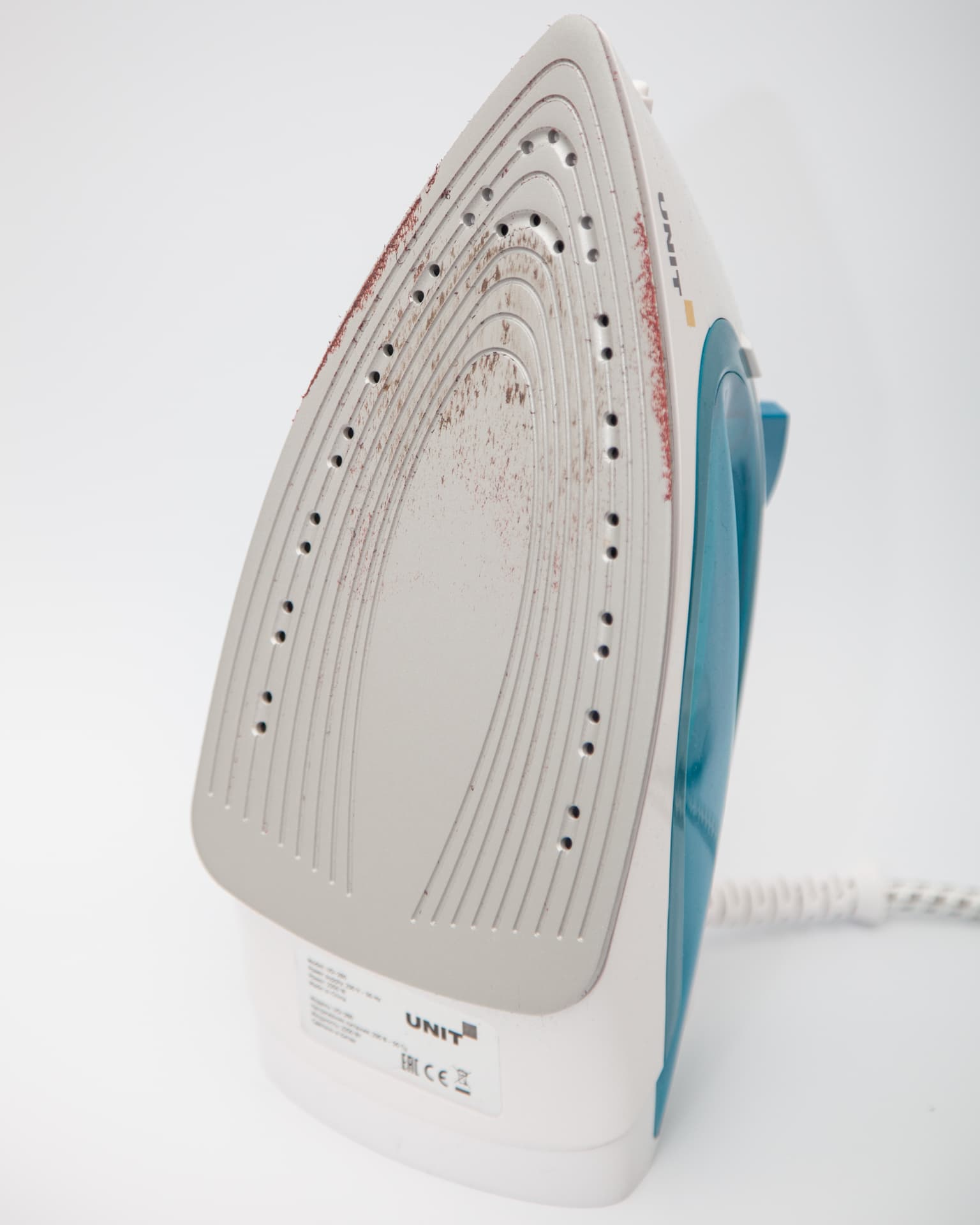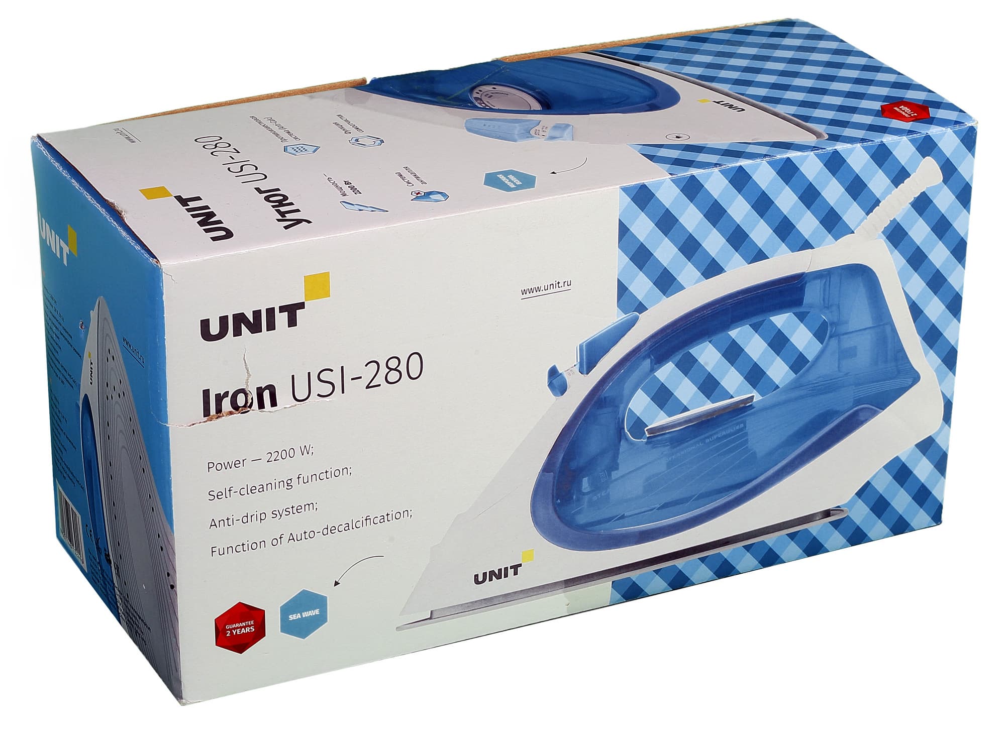 Unit USI-280 имеет классическую форму. Корпус изготовлен из белого и прозрачного бирюзового пластика, сквозь который хорошо просматривается объем воды в резервуаре. Вес прибора небольшой, ручка размещается в руке удобно.