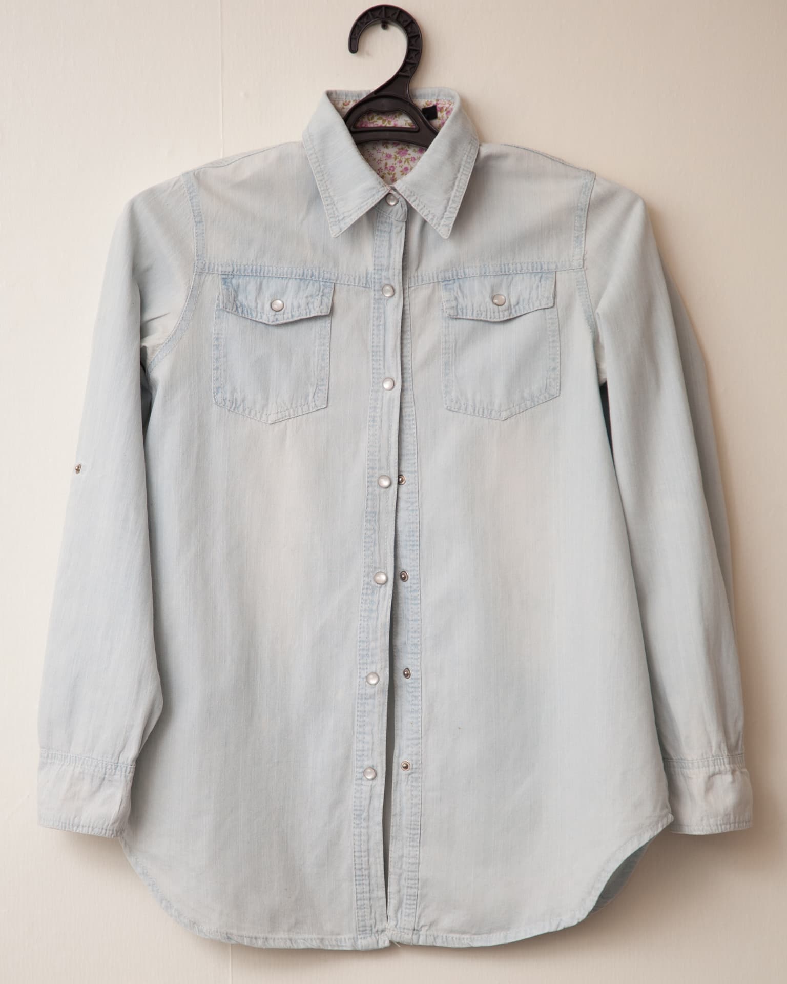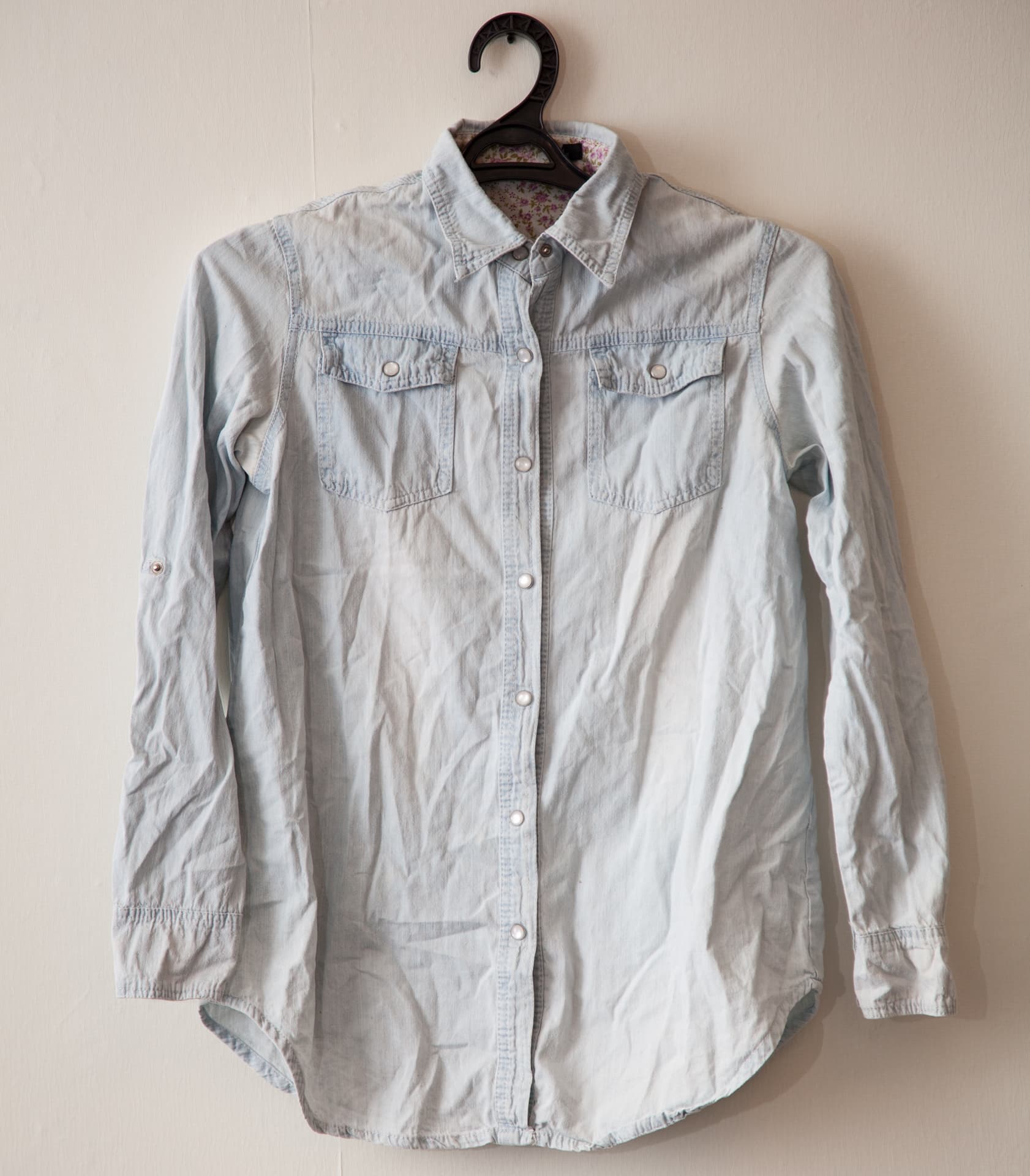 Это джинсовая рубашка из 100% хлопка. Ткань средней плотности, ближе к тонкой, сильно мнущаяся и образующая заломы. Обработку производили также на третьем температурном режиме с беспрерывной подачей пара.