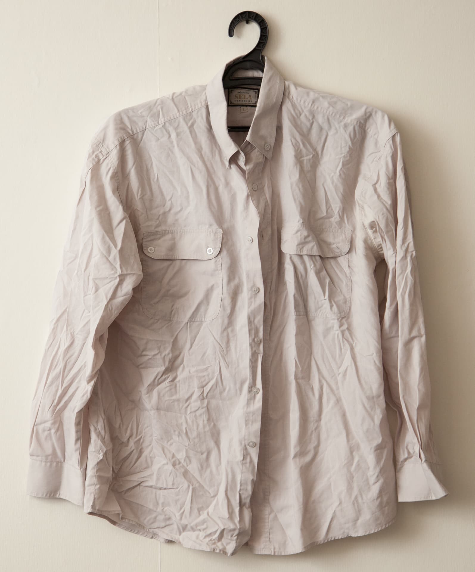 Ткань этого предмета одежды изготовлена из смеси хлопка и какого-то синтетического материала. Обычно с глажкой этой рубашки проблем не возникает — полотно разглаживается без усилий. Поэтому после стирки мы сушили рубашку в специально замятом виде. Включили термостат на 3-й режим (хлопок), подключили беспрерывную подачу пара и приступили к процессу.
