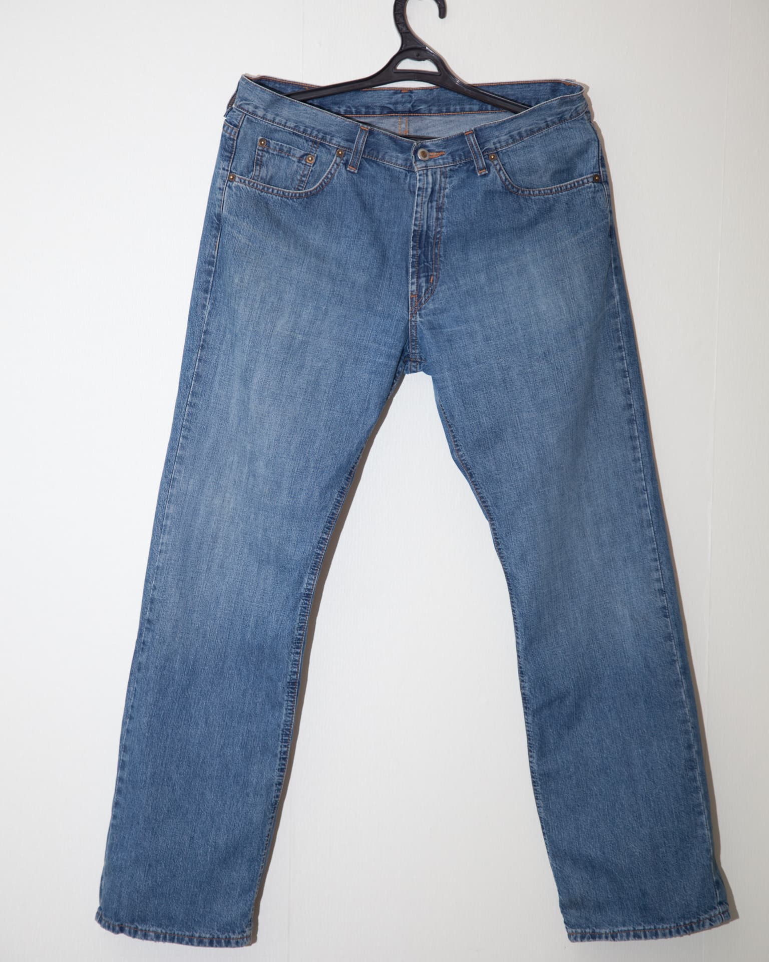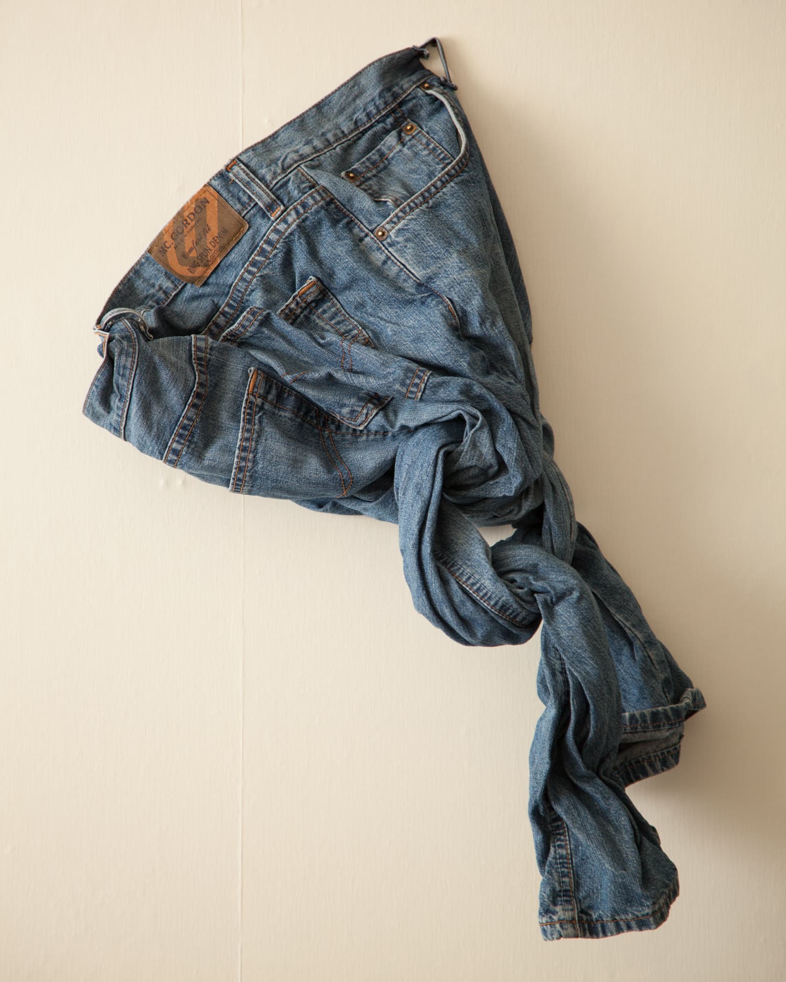 Данное изделие изготовлено из плотной и толстой джинсовой ткани. Задние накладные карманы, хлястики, заклепки — в общем, обычные мужские джинсы. Дабы сделать задачу еще труднее, мы сушили их на батарее не просто в свернутом виде, а завязав брючины узлом. Даже двумя.