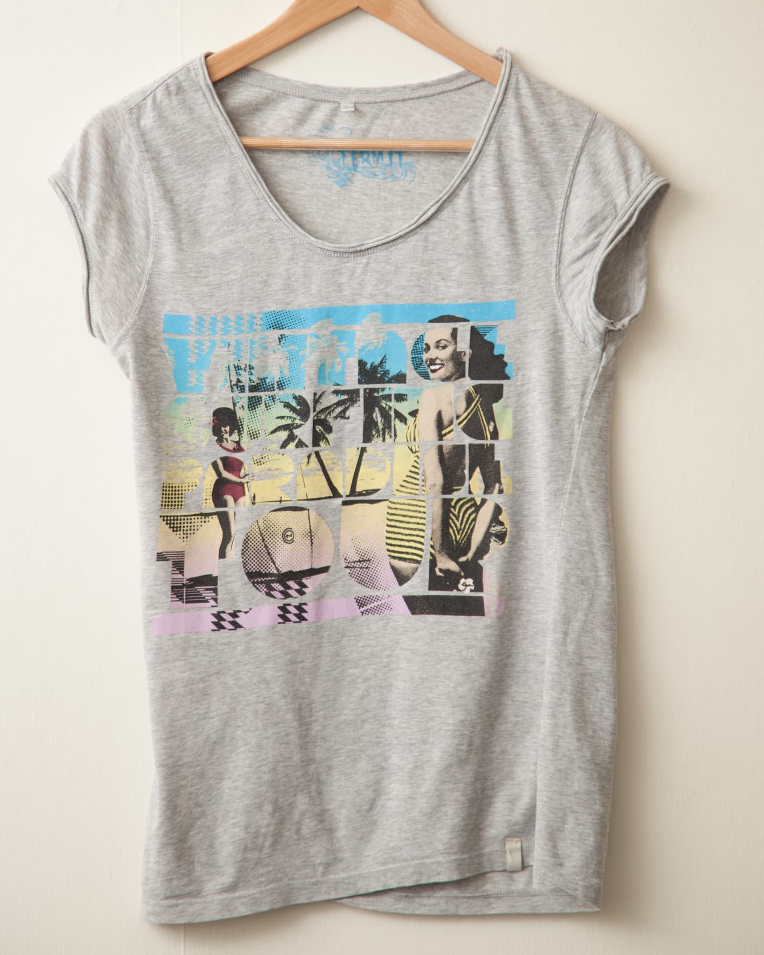 Футболка изготовлена из тонкого хлопка, долго хранилась в шкафу. На ткани были видны сильные заломы от хранения в сложенном виде. Эту вещь мы решили разгладить без использования пара. Гладили на третьем температурном режиме, предназначенном для хлопка. Как видно на фотографии, результат вполне удовлетворительный — ткань гладкая, без замятий и морщин, принт от действия температуры не пострадал.