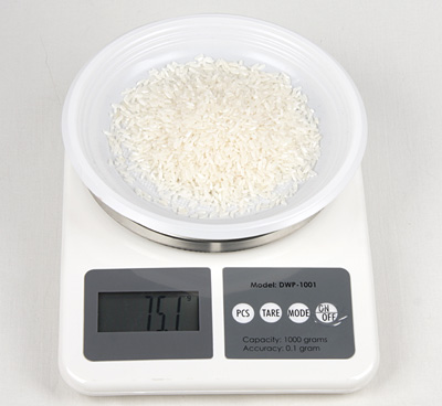 Для взвешивания риса применяются электронные весы DWP-1001, позволяющие взвешивать до 1 кг и имеющие дискретность отсчета 0,1 г и примерно такую же погрешность взвешивания.