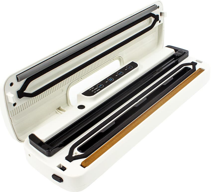 Кстати, внутри вакууматора может быть предусмотрена емкость для хранения пакетов или рулона пленки, а также специальный нож для их резки. На наш взгляд, довольно удобно.