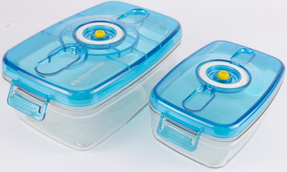 Еще один вариант — воспользоваться специальным контейнером (опять-таки с клапаном). Тут нам снова понадобится специальный шланг, с помощью которого из контейнера будет откачиваться воздух. Пользоваться контейнерами удобно. В первую очередь потому, что их легко отмыть (как вручную, так и в посудомойке). Таким образом мы избавляемся от необходимости докупать не самые дешевые пакеты (и заодно меньше засоряем окружающую среду!). Увы, но для приготовления в су-виде контейнеры опять-таки не подойдут.