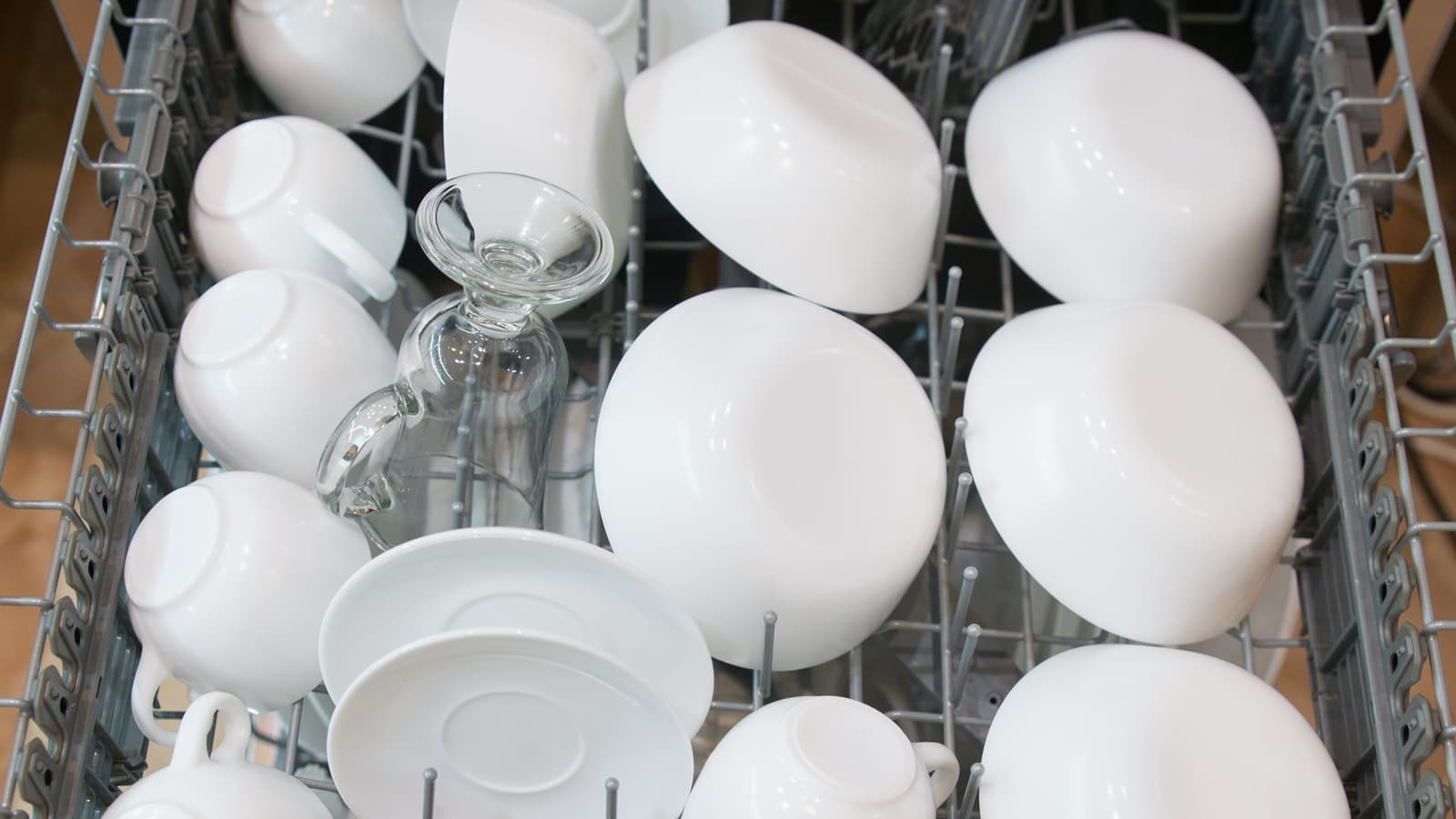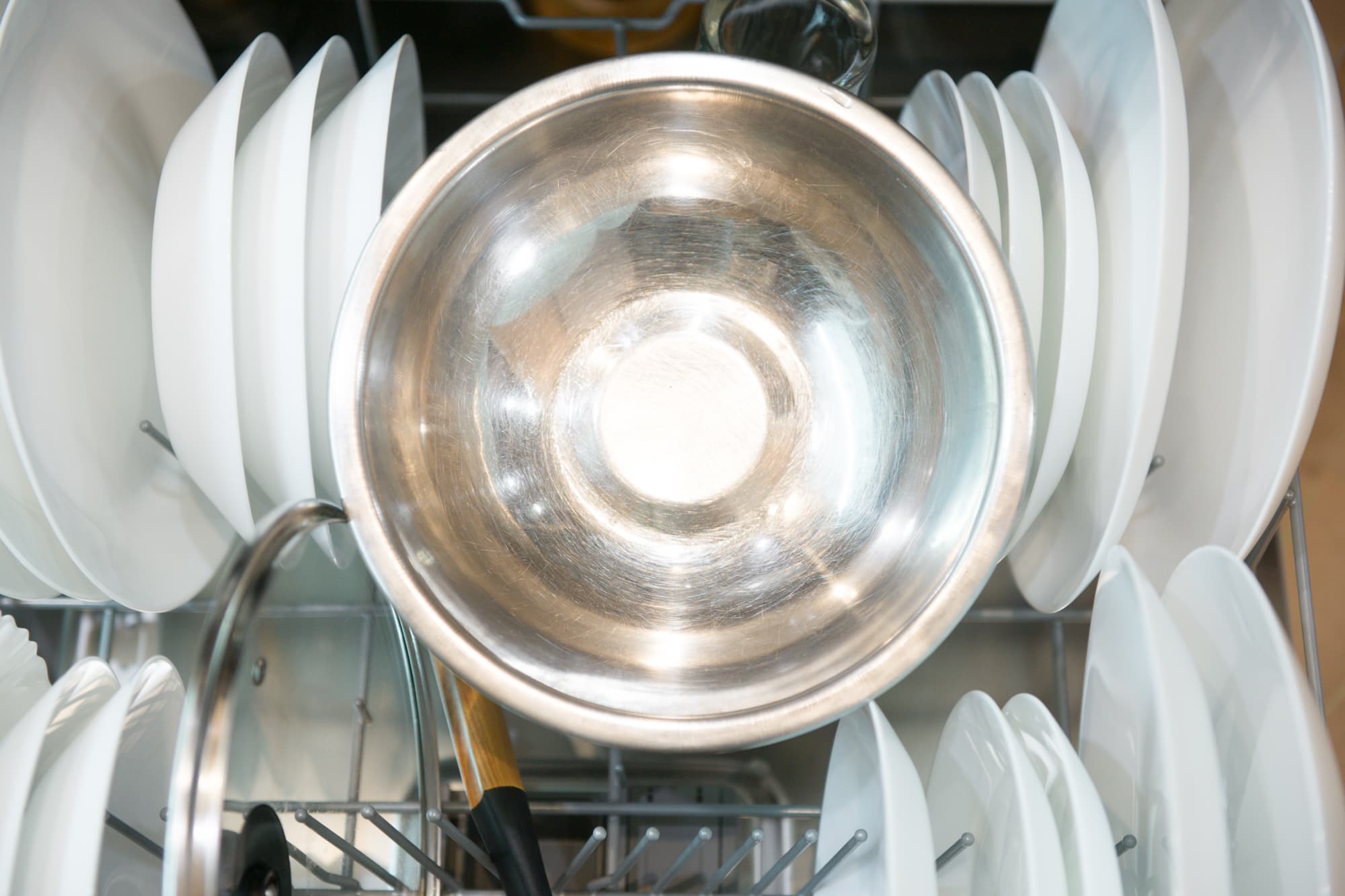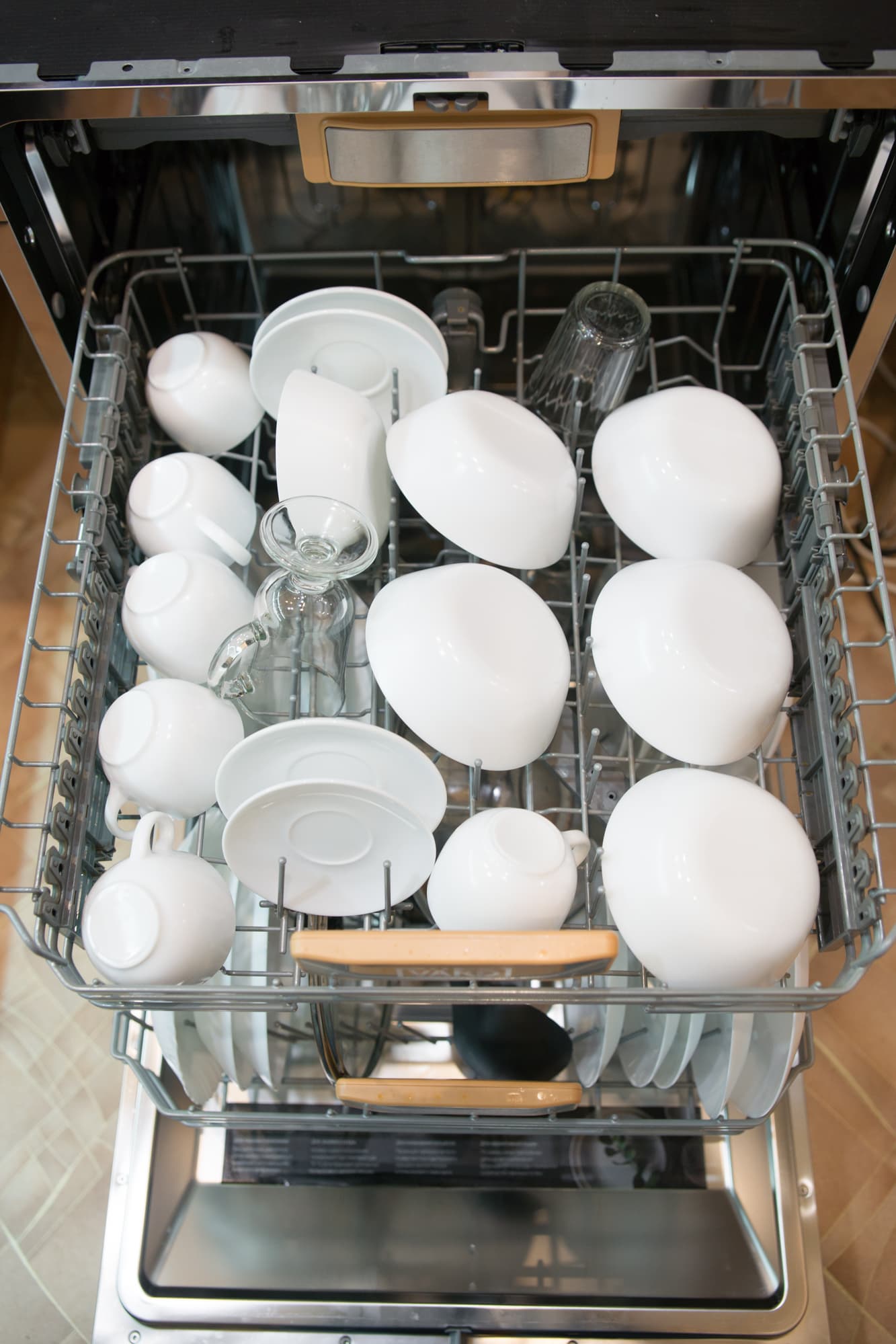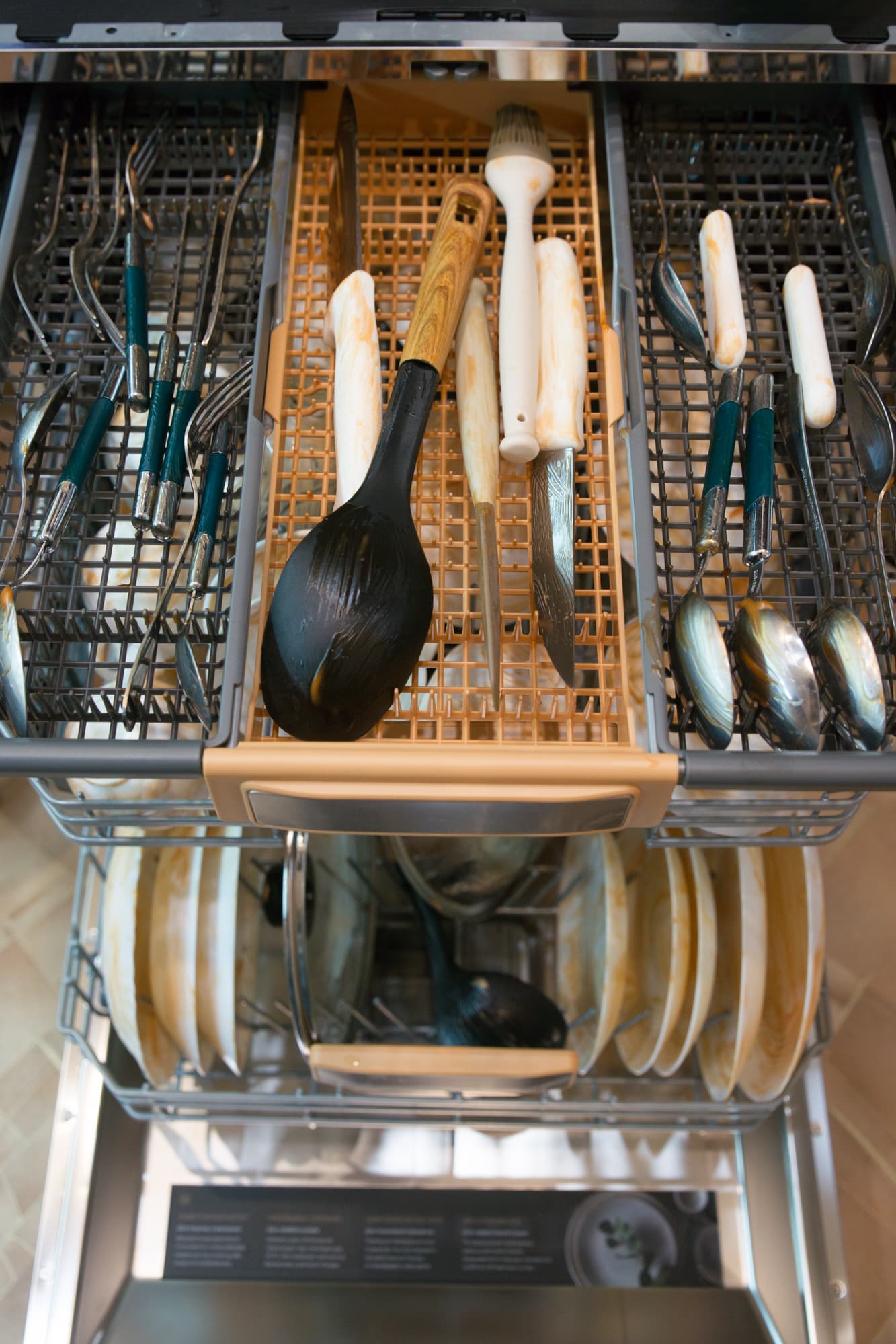 Результат порадовал. При такой плотной загрузке не нашлось ни одного предмета, который бы оказался плохо промытым. Идеальной чистоты достигли и столовые приборы на верхней полке.