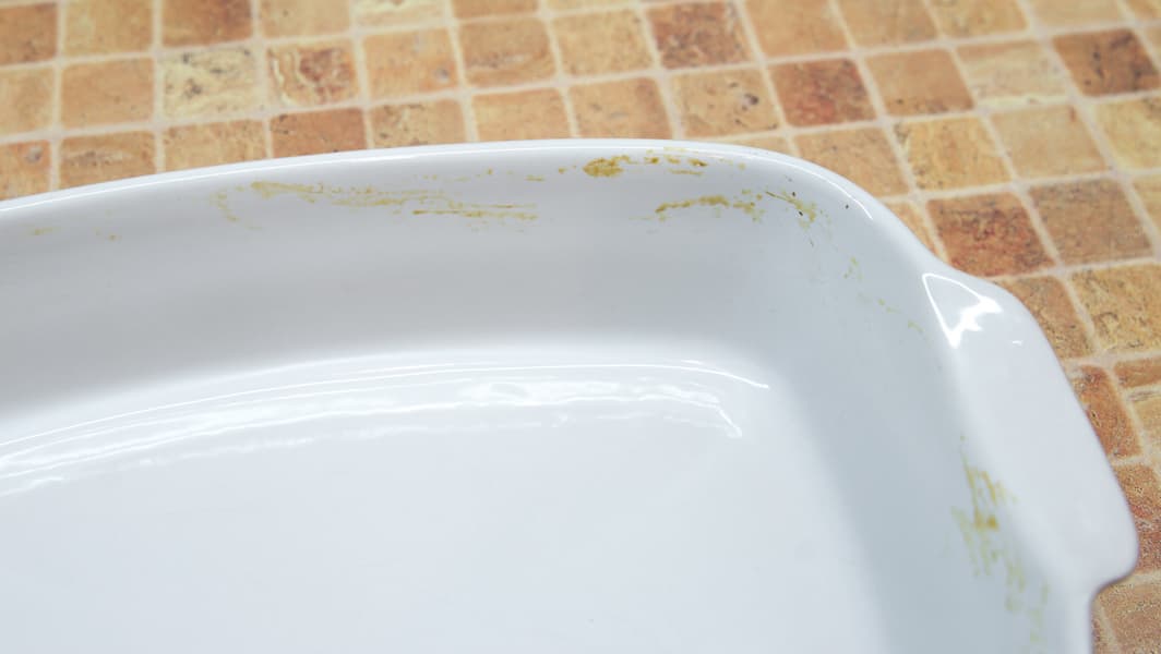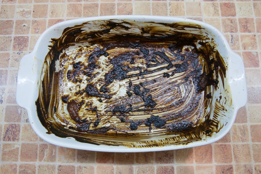 Для этого теста мы взяли прилично запачканную керамическую форму, в которой запекалось мясо в соусе, добавили туда майонез и припекли всё это в режиме Гриль. Вот такая красота у нас получилась. Было ощущение, что мы перестарались, но так даже интересней. Емкость снова подсыхала в течение суток.