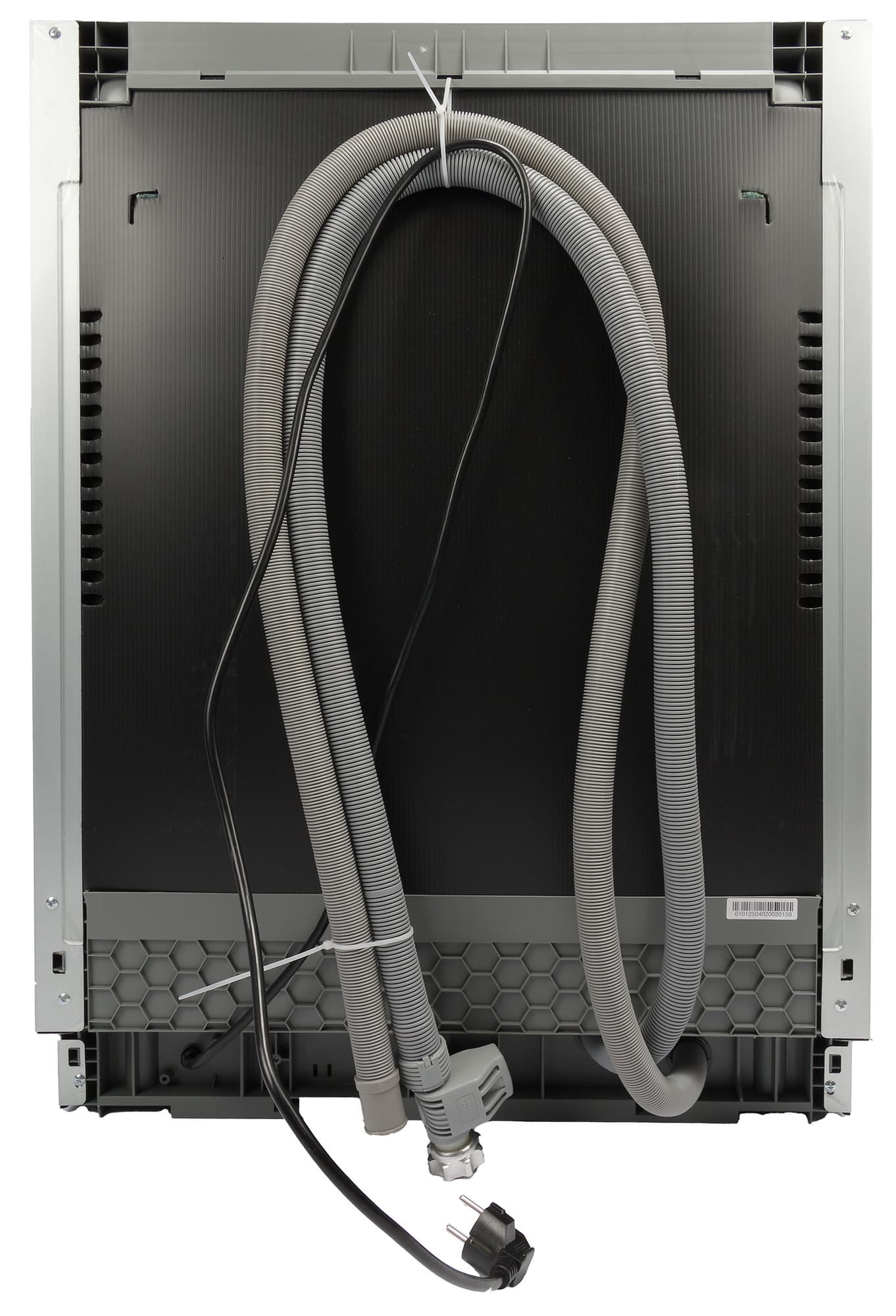 В нижней части задней стенки из корпуса выходят гофрированные шланги: заливной, снабженный клапаном защиты от протечек, и сливной. Рядом с ними — выход сетевого кабеля с вилкой.