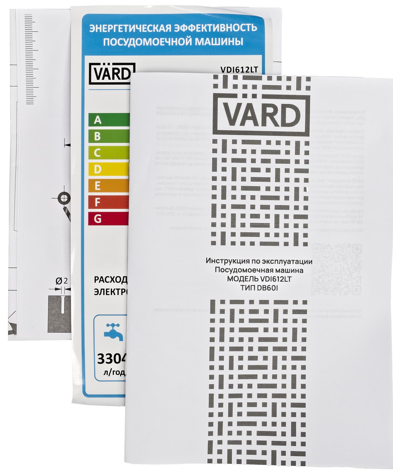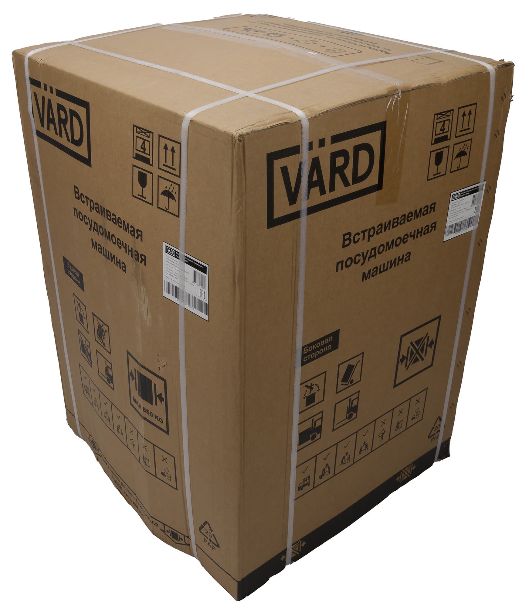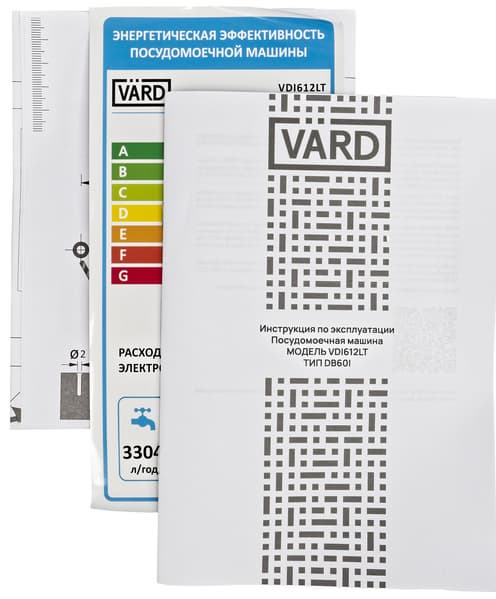 Посудомоечная машина Vard VDI612LT поставляется в коробке из прочного коричневого картона, стянутой пластиковой лентой. На гранях упаковки размещены логотип компании, информация о модели, а также ряд транспортировочных значков.