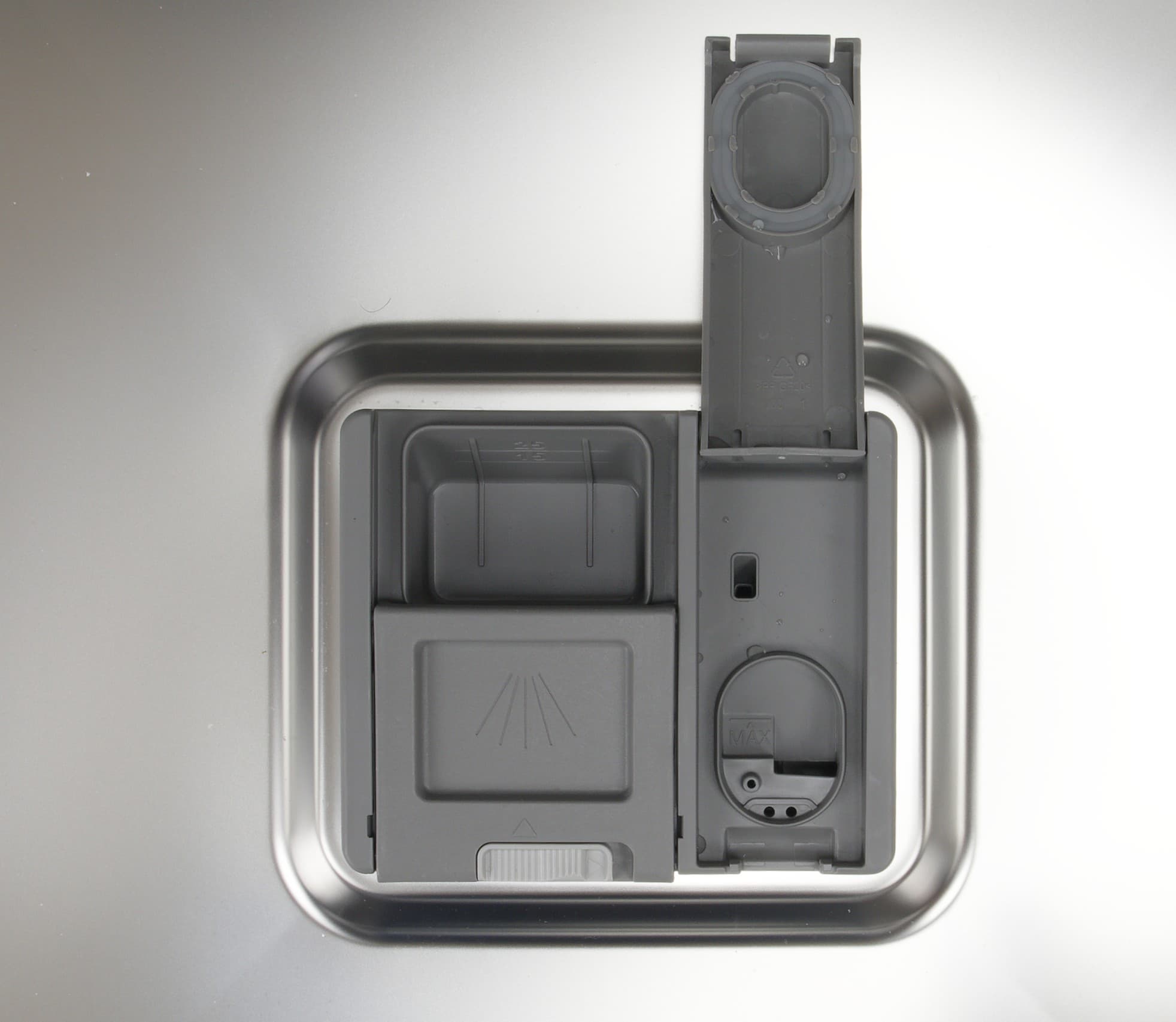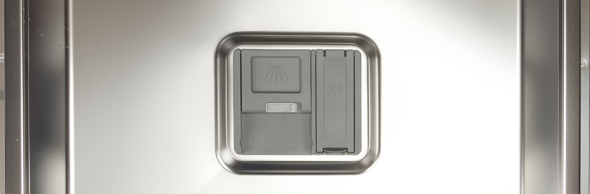 Контейнер для моющих средств разделен на две части: левая, со сдвижной заслонкой, предназначена для порошка и таблеток, в правой за откидывающейся крышкой скрывается резервуар для ополаскивателя.