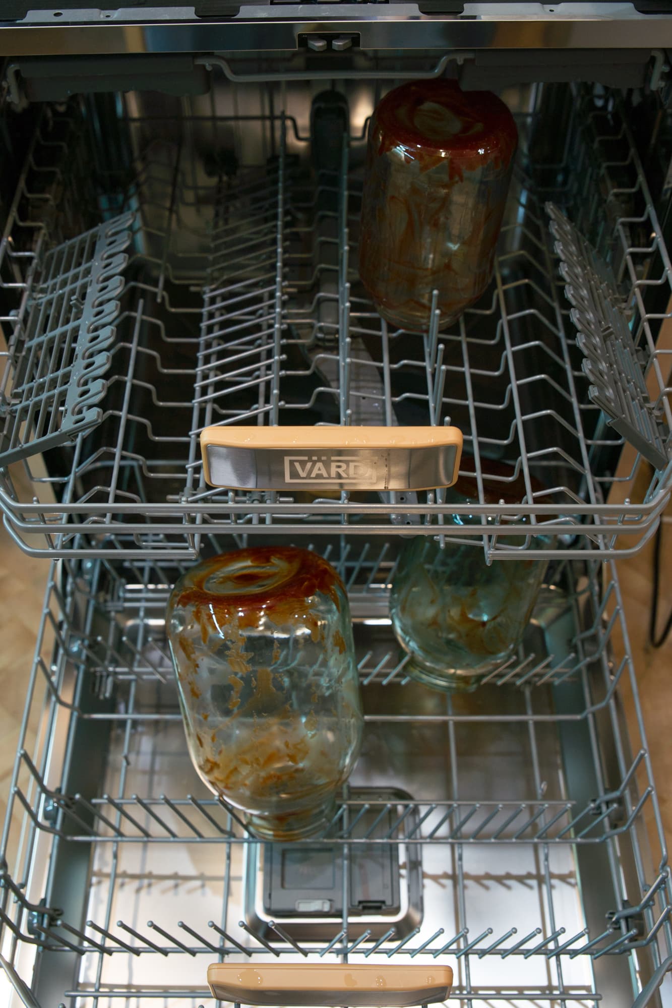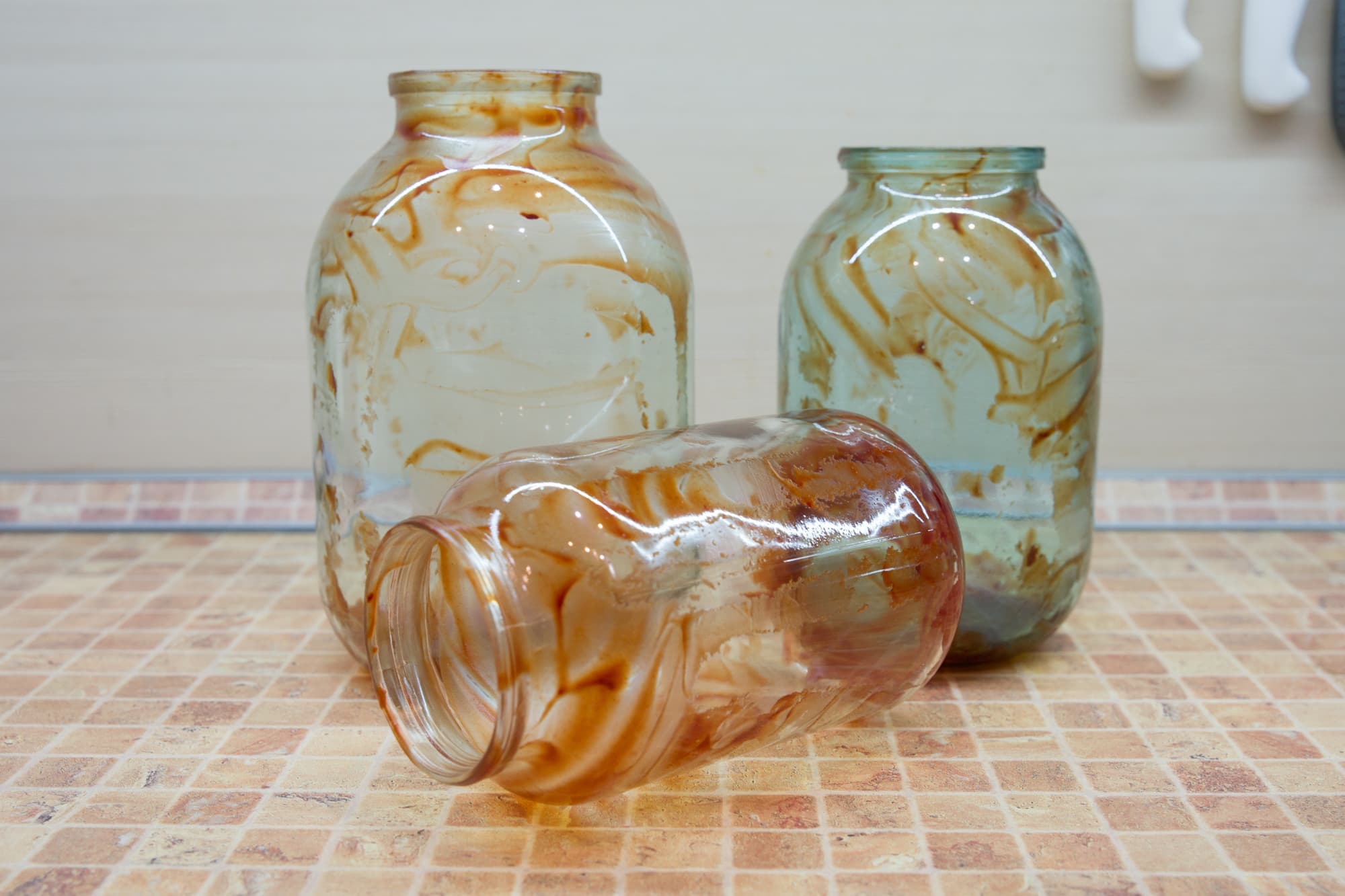 Для тестирования самой экономичной по расходам воды и электроэнергии программы мы взяли три банки разного размера и обильно намазали их изнутри уже знакомым нам кетчупом.