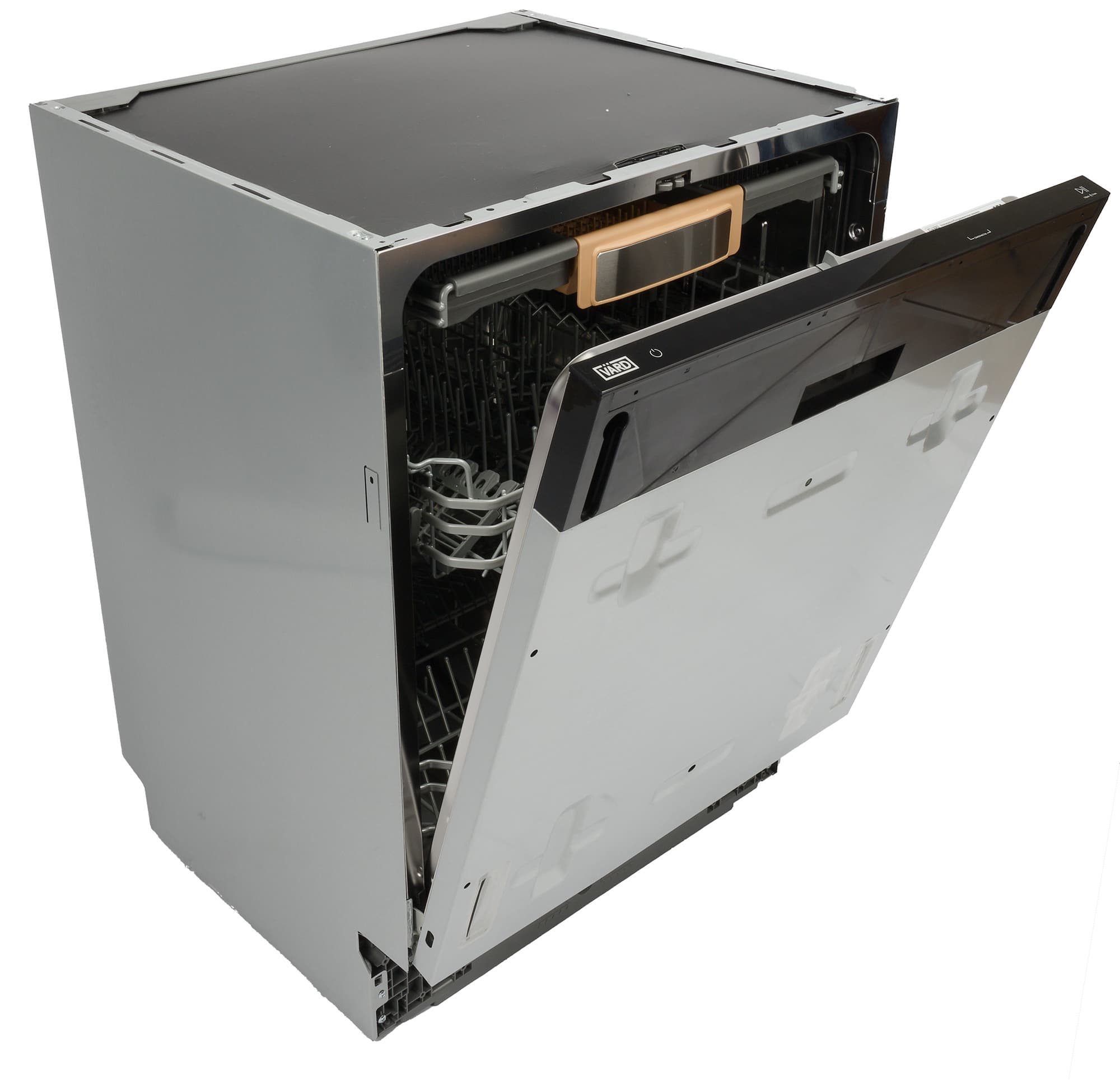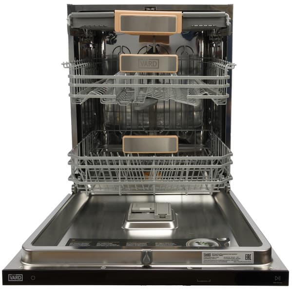 Так как посудомоечная машина Vard VDI612LT — полностью встраиваемая модель и после установки она целиком будет скрыта за мебелью, корпус ее абсолютно лишен каких-либо дизайнерских изысков.