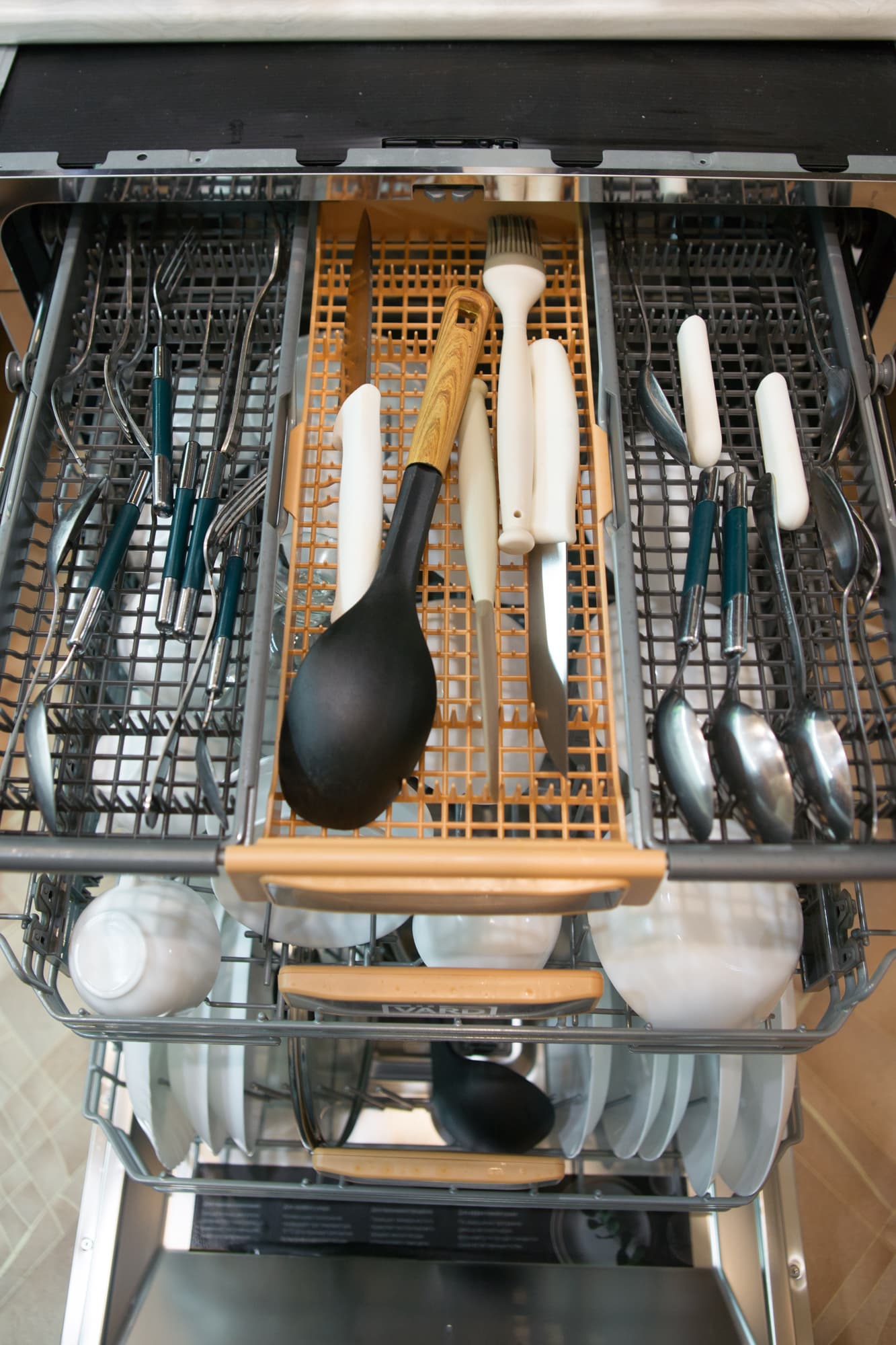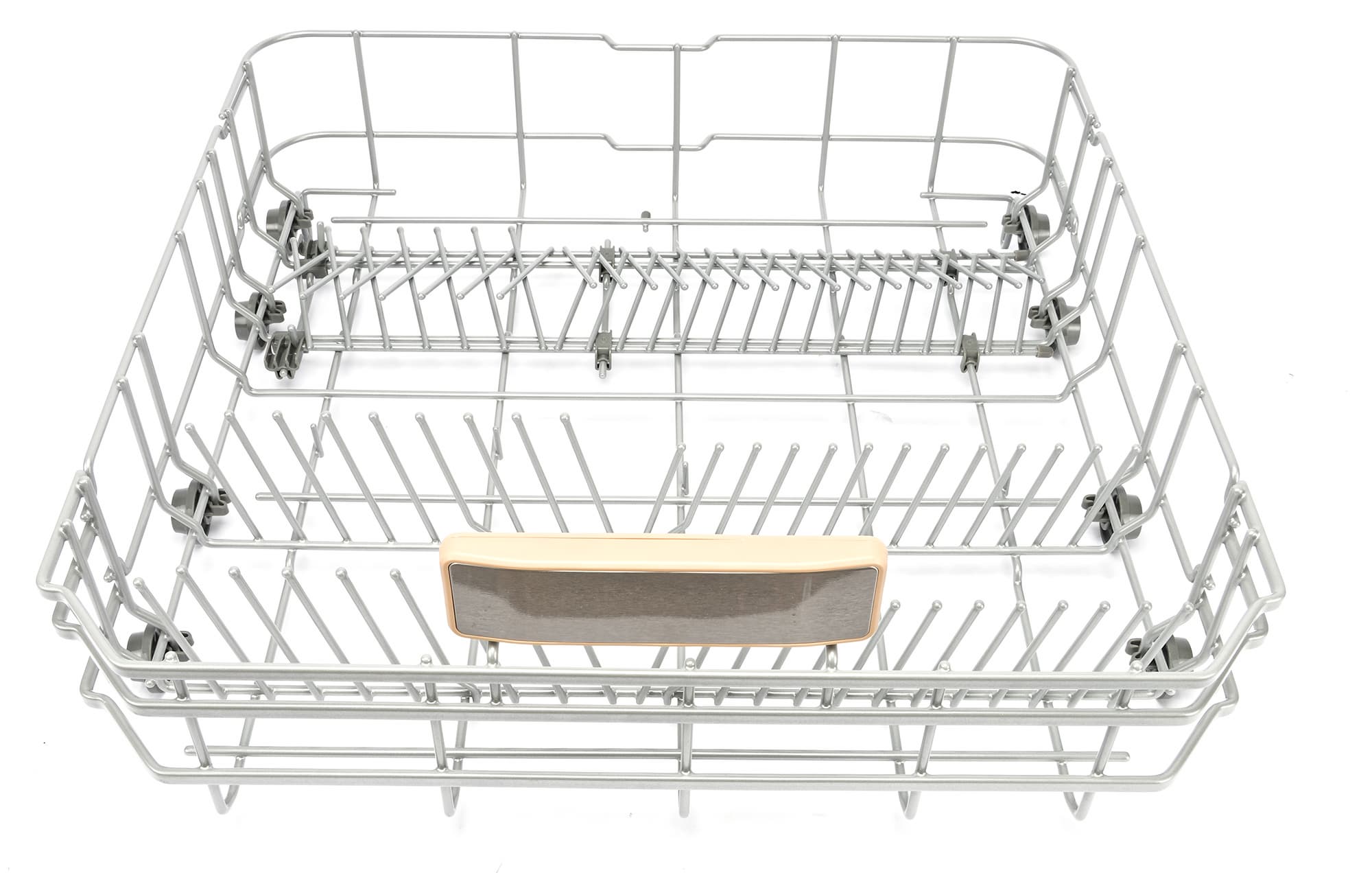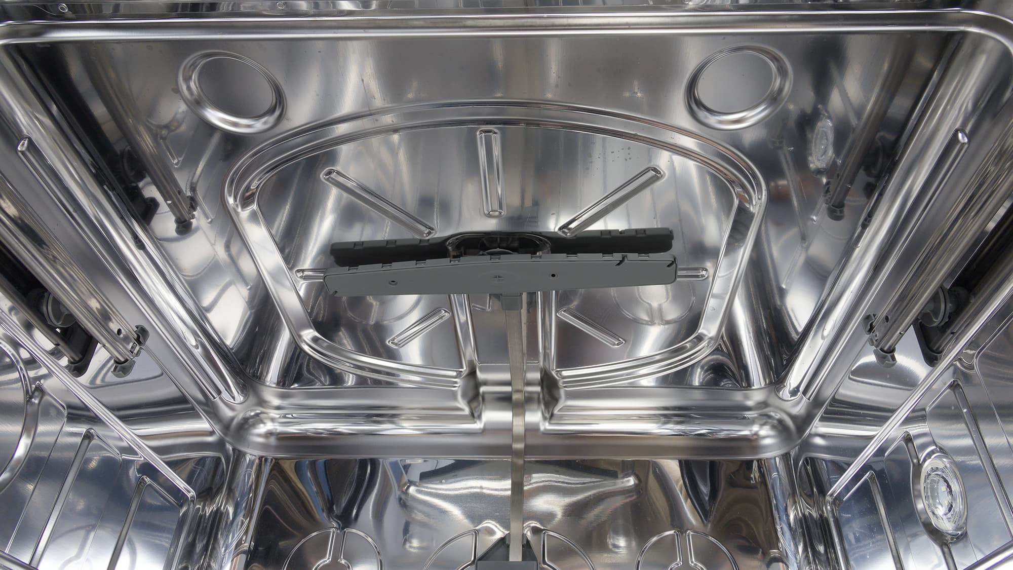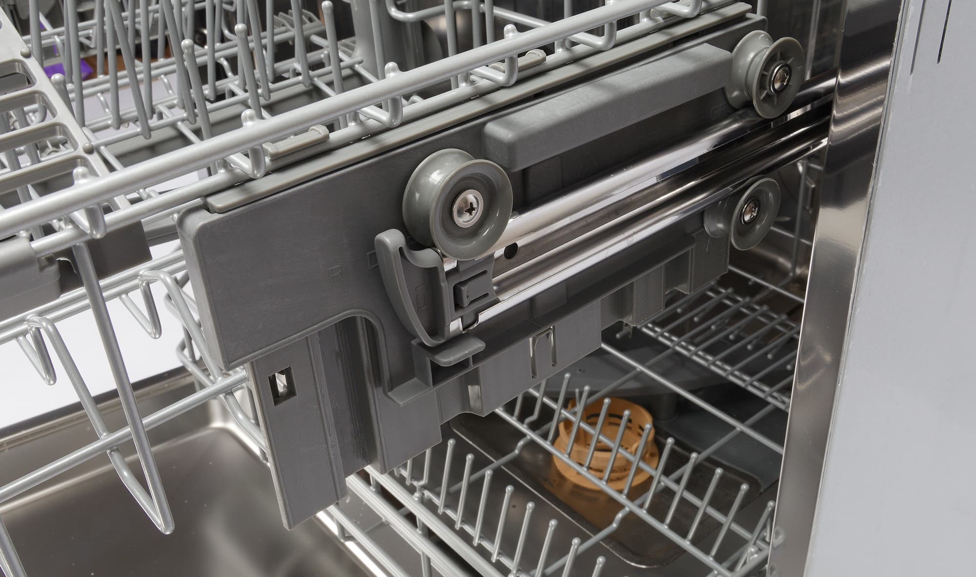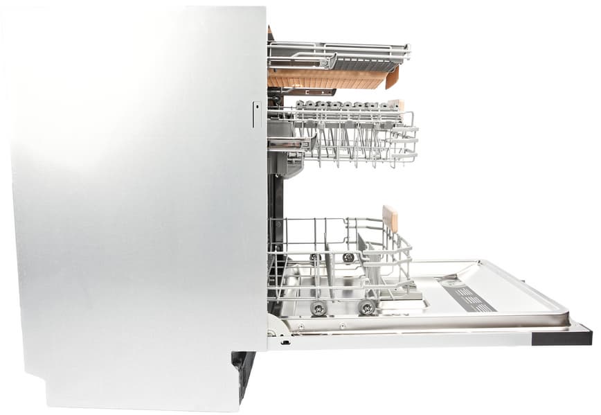 Ролики нижней корзины, как и у большинства посудомоечных машин, скользят по выпуклым направляющим в корпусе. Все три корзины можно извлечь полностью.