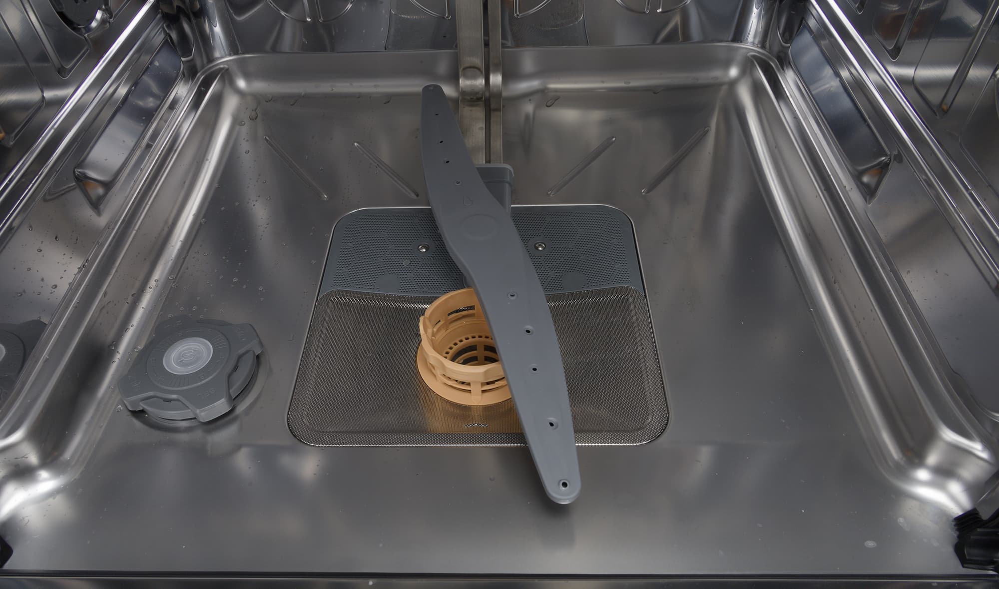 Бак машины сделан из нержавеющей стали. На дне мы видим фильтр традиционной конструкции и горловину смягчителя, в которую засыпается специальная соль.