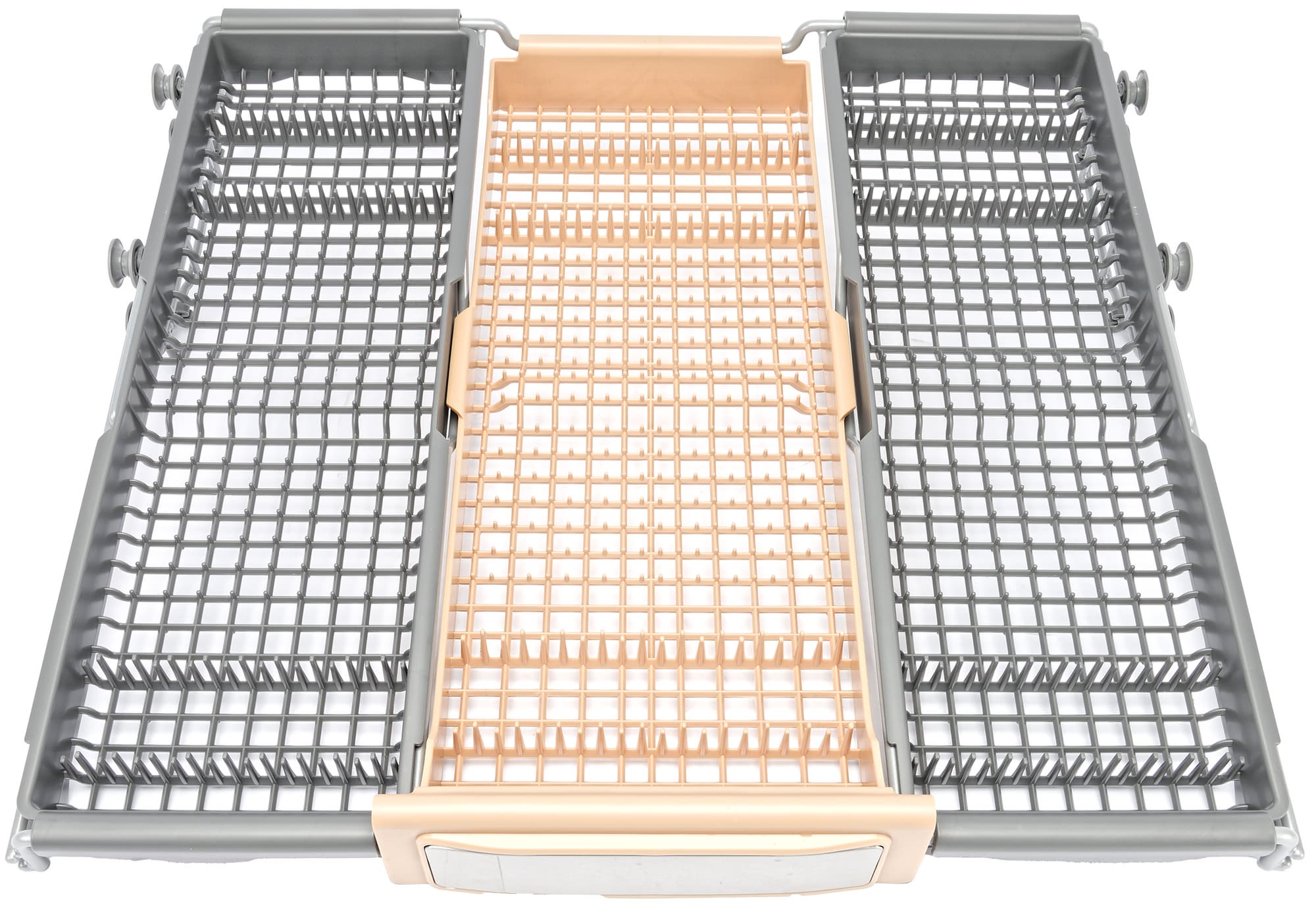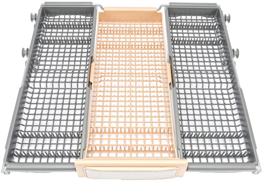 Верхняя корзина имеет три секции. Вилки, ложки и ножи следует размещать слева и справа, по центру можно положить что-то более крупное. Если в среднюю корзину требуется поставить крупную и высокую посуду, любой из трех лотков можно снять.