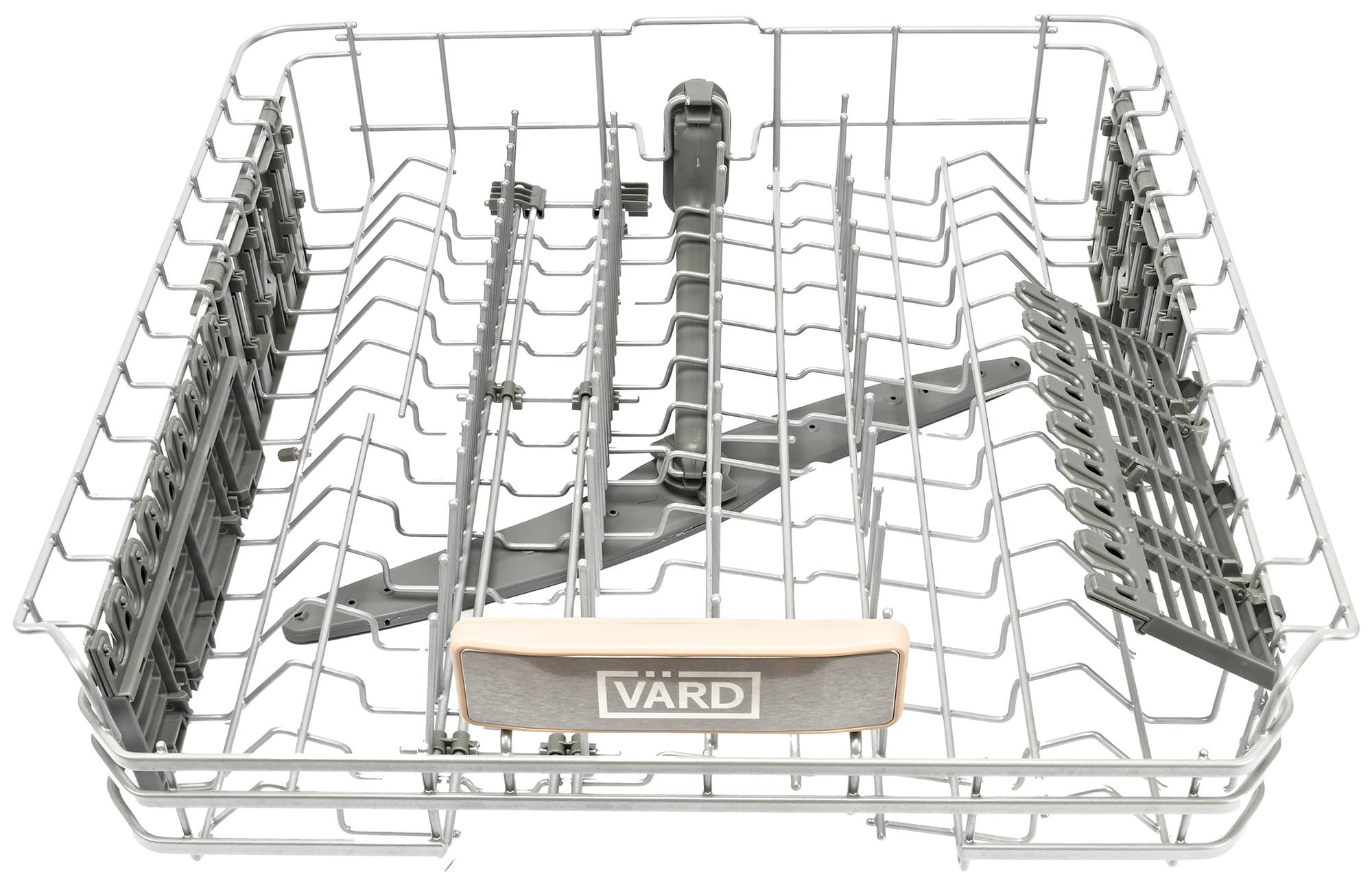 По краям средней корзины расположены откидные полки для чашек и ножек бокалов. В центре — пара рядов неподвижных направляющих для блюдец и десертных тарелок. Зубья в левом ряду складываются.