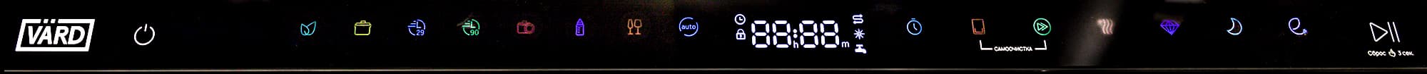 Как это обычно и бывает у всех полновстраиваемых посудомоек, панель управления Vard VDI612LT размещена на верхней кромке дверцы. Когда машина закрыта, панель скрыта под столешницей.