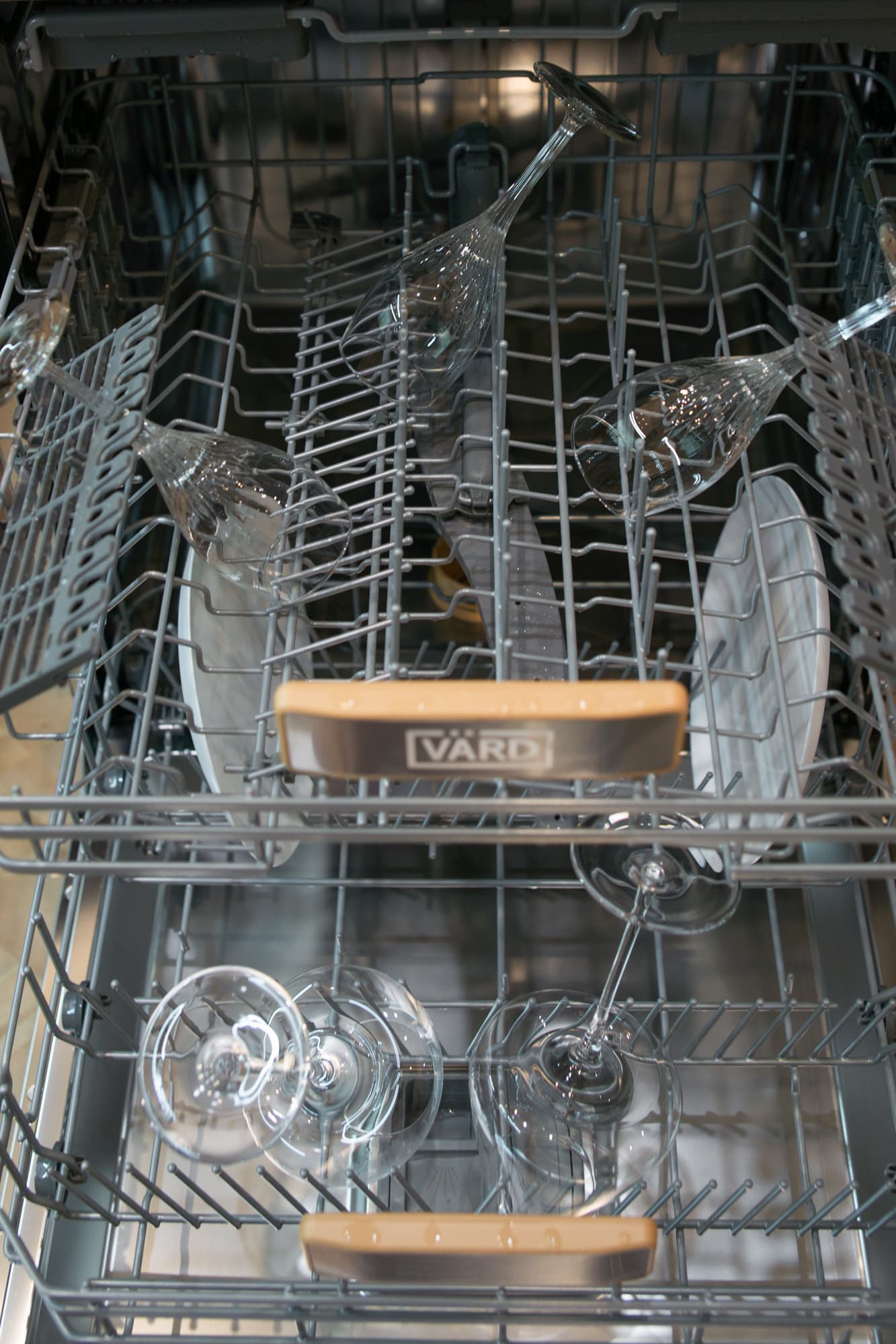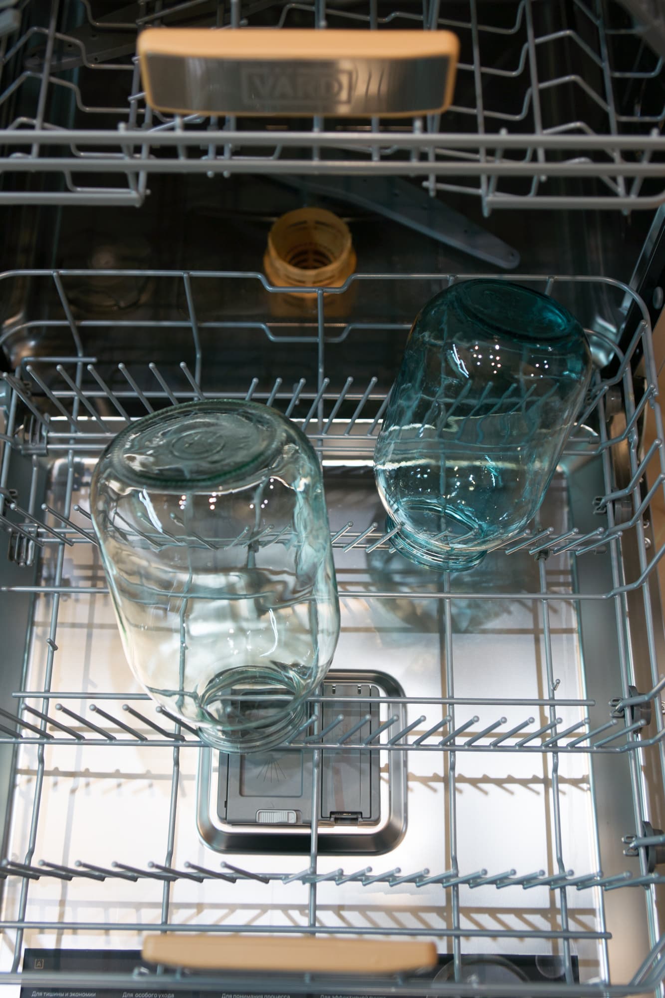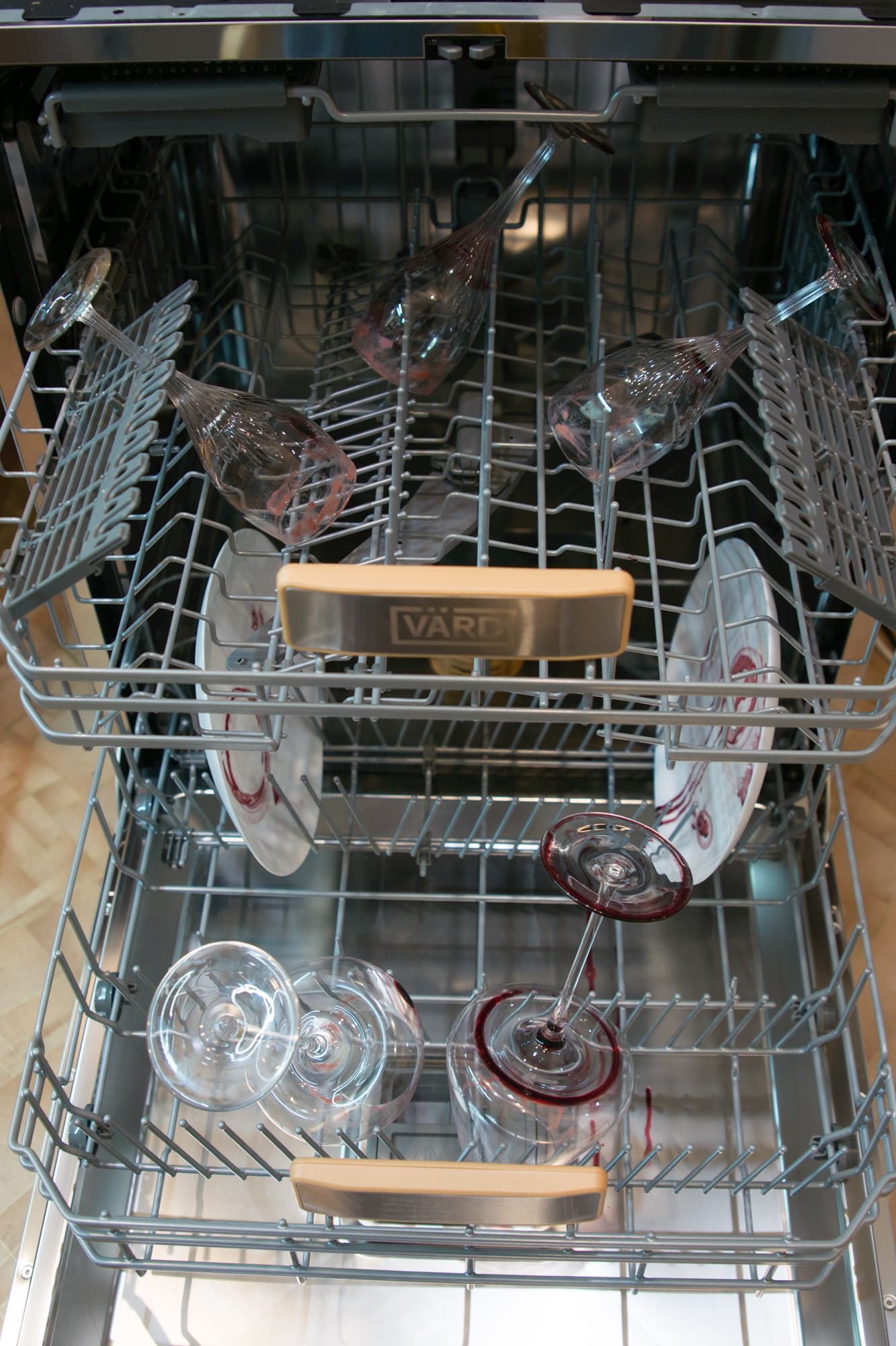 Крупные хрупкие бокалы мы расставили в нижней корзине, там они четко поместились между зубьями первого ряда и не болтались. Пару тарелок с винными следами поставили в дальний ряд. Три бокала меньшего размера удачно встали в верхнюю корзину. Для этого теста мы запустили программу Бокалы, специально предназначенную для слабозагрязненной посуды и стекла.