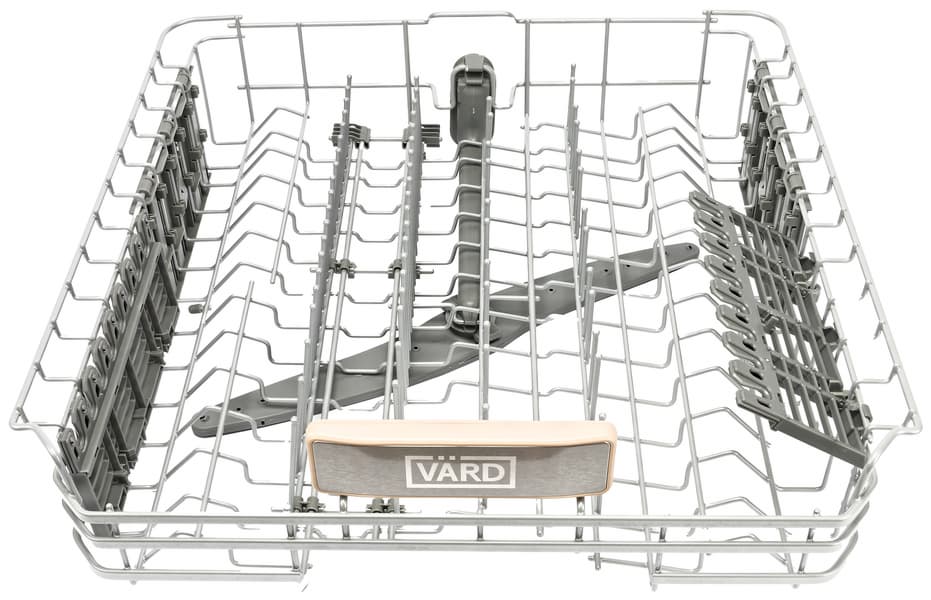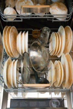 У посудомойки три корзины: верхняя предназначена для столовых приборов, нижняя — для крупной посуды, кастрюль и сковородок, а средняя — для десертных тарелок, чашек, блюдец и других небольших предметов. Согласно паспортным данным, устройство вмещает до 16 комплектов посуды.