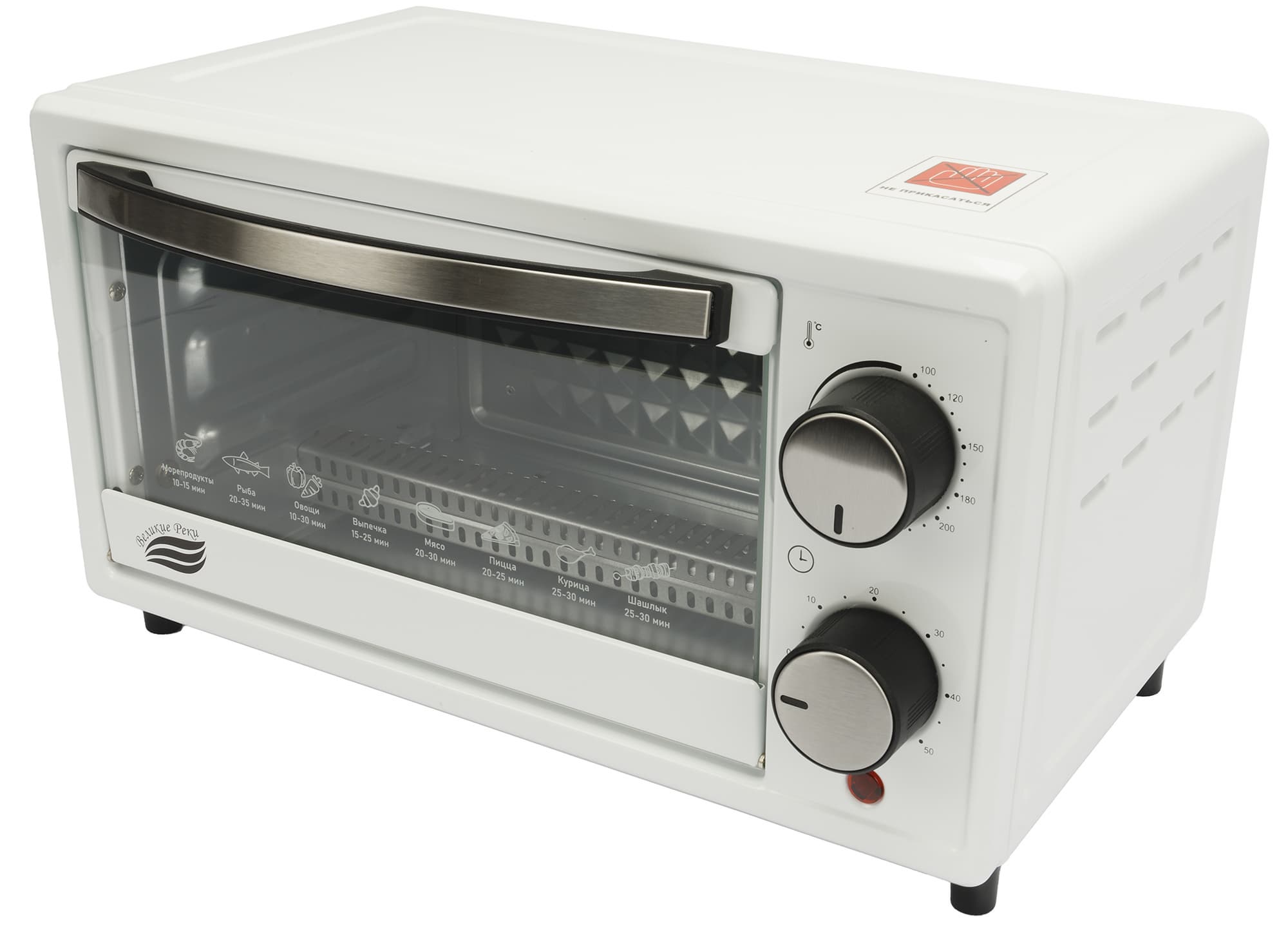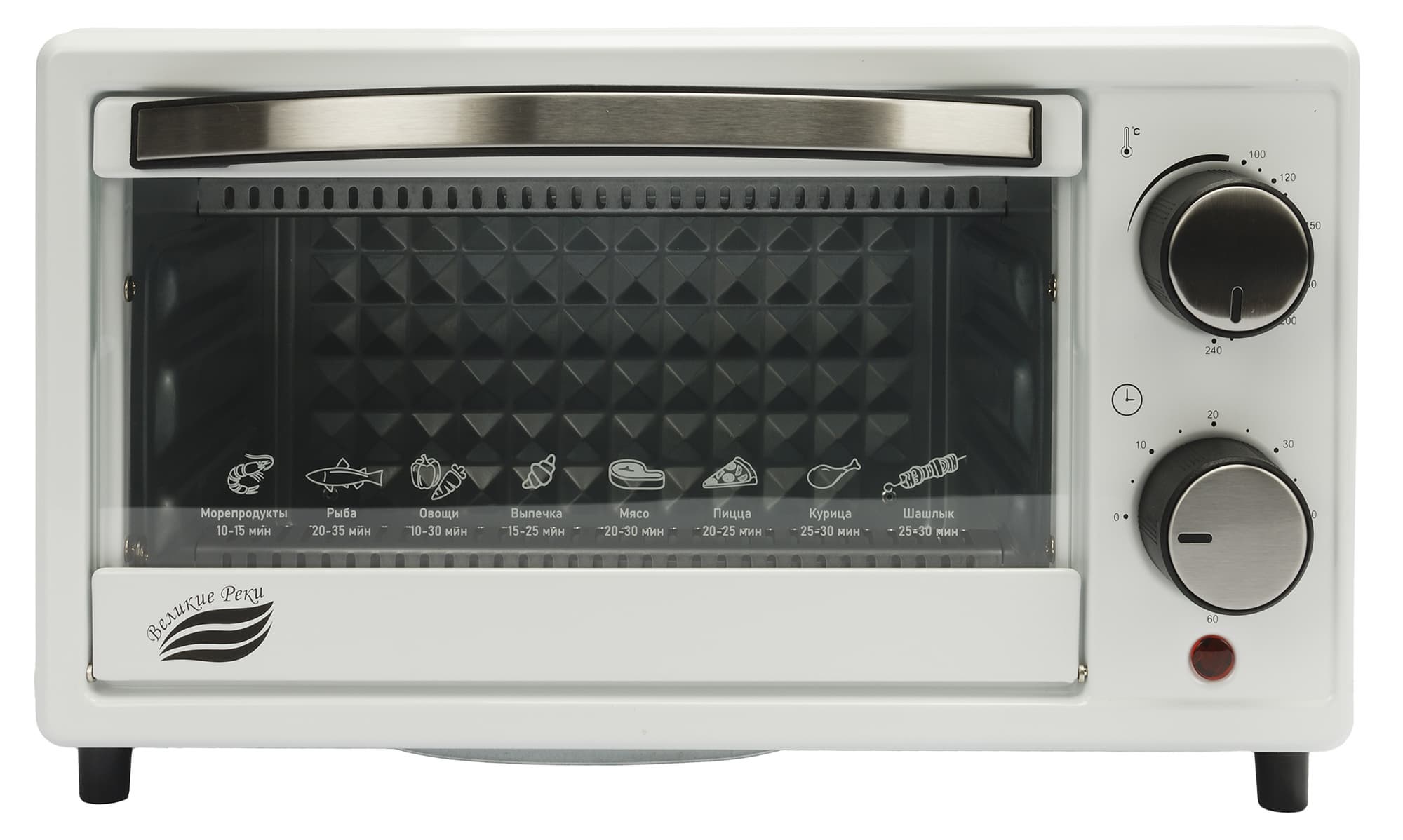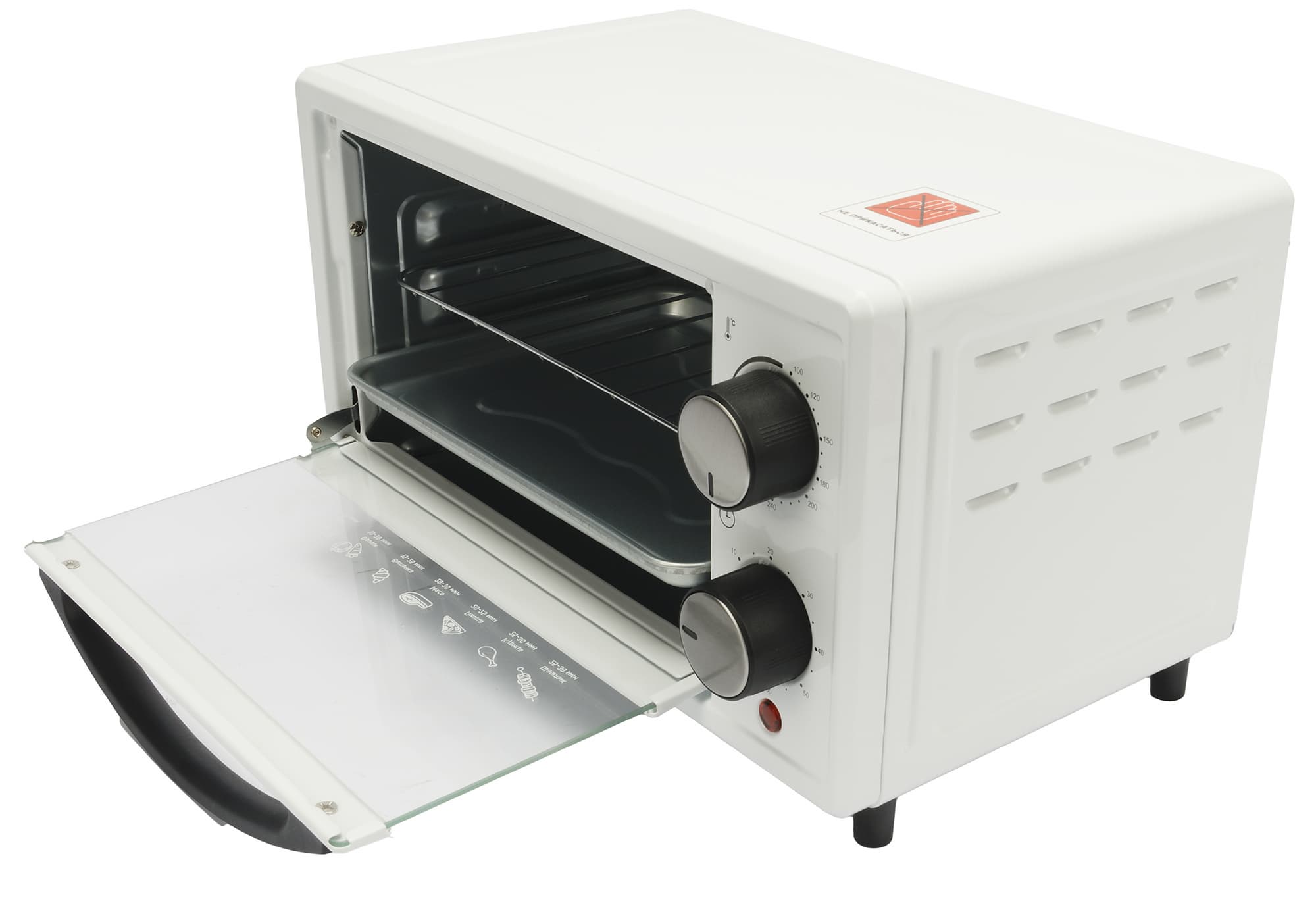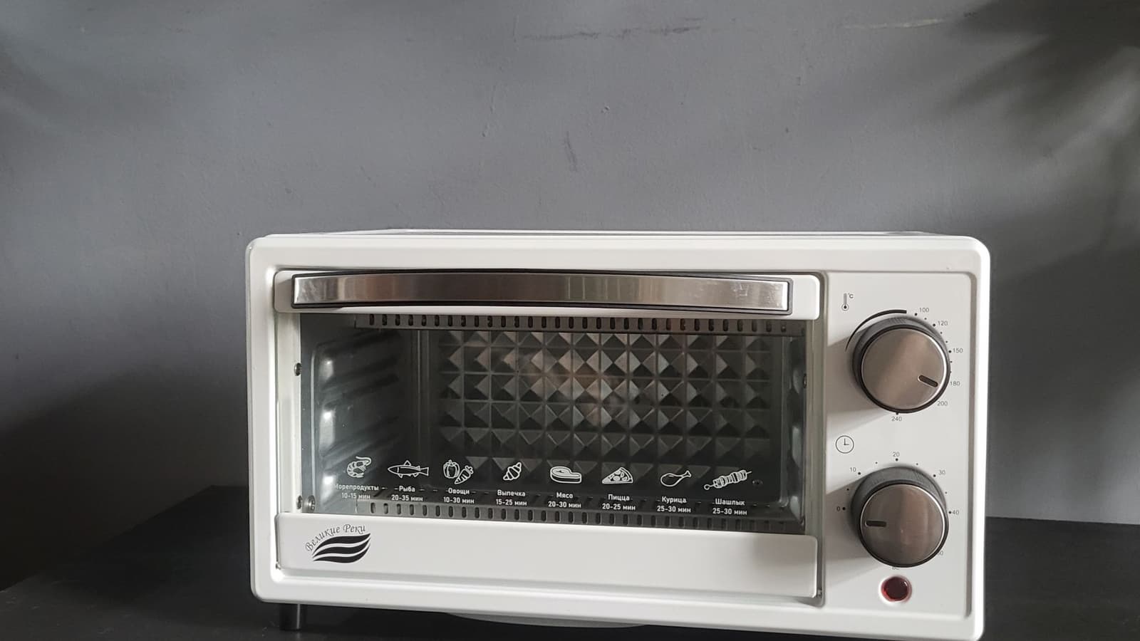 Дверца открывается вперед, как и положено дверце духовки, также на ней есть пиктограммы с указанием времени приготовления разных продуктов (хорошо бы тогда было указать еще и температуру).