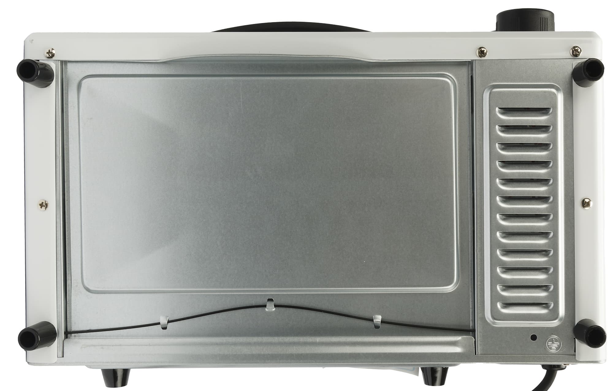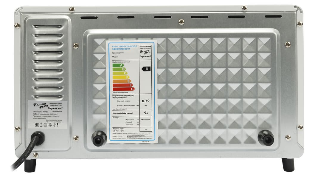 На задней панели микроволновки расположены вентиляционные отверстия, а также зафиксирован шнур питания. Две черные ножки предотвращают плотное прилегание прибора к вертикальным поверхностям. Здесь же размещен шильдик с техническими характеристиками устройства.