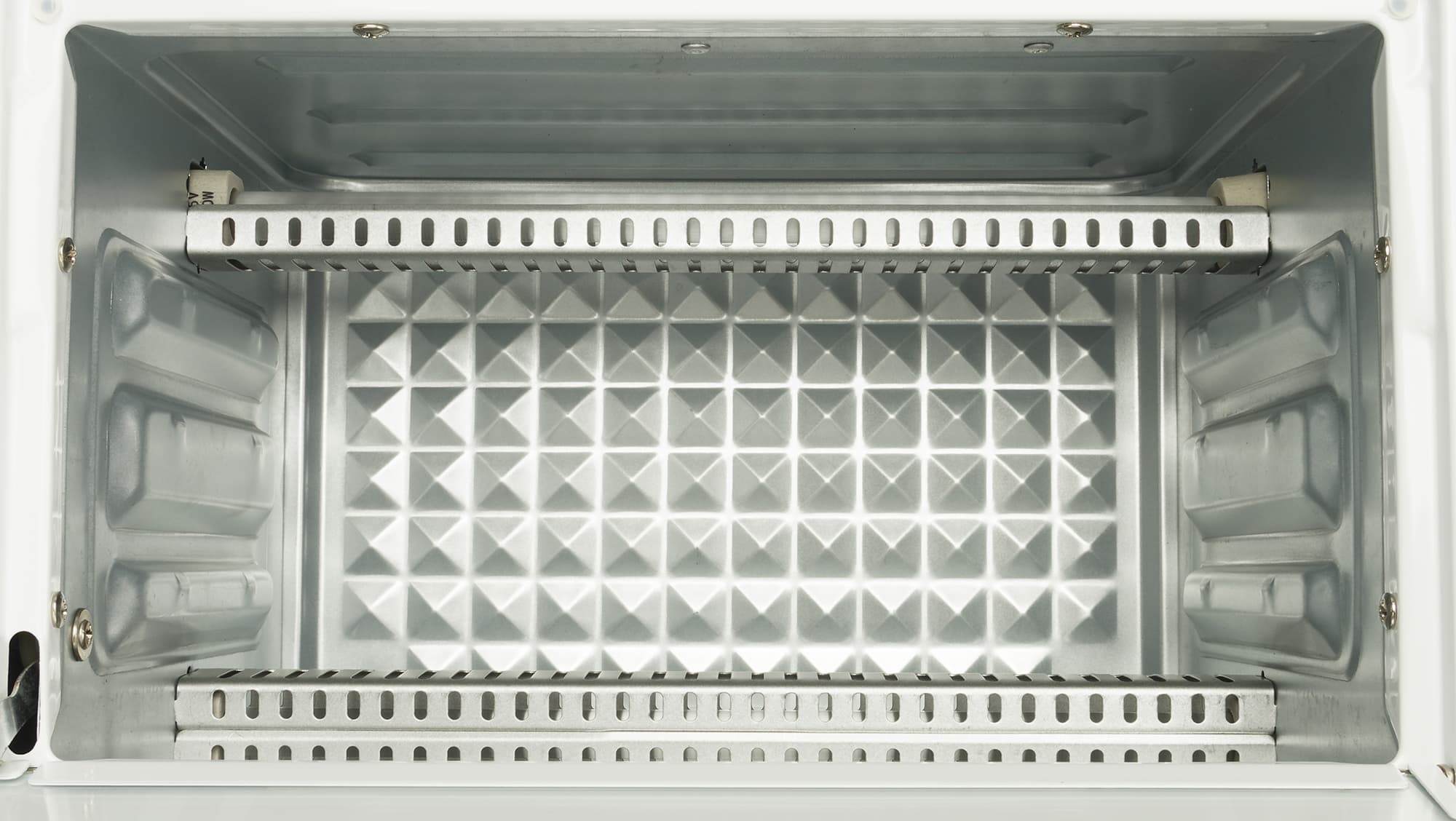 Внутри — сверху и снизу — два кварцевых тэна. Производитель пишет о трех уровнях установки противня, но если мы внимательно посмотрим внутрь духовки, то увидим, что на самом деле их два. Причем самый ходовой — нижний, иначе на верхнем уровне продукты подгорят от жара верхнего тэна (подробнее мы напишем в разделе «Практические тесты»).