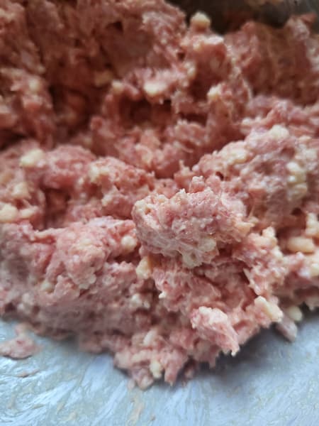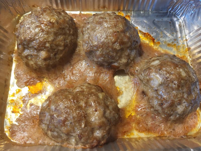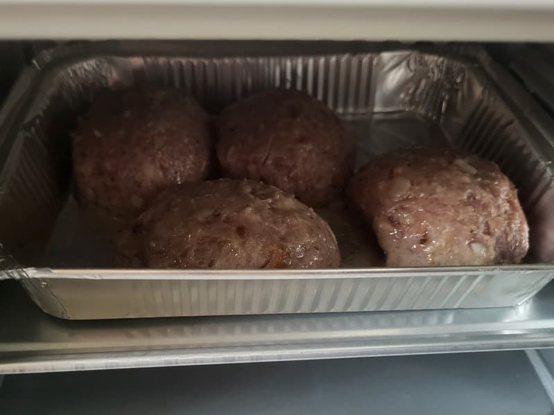Рассказывать, как нужно делать котлеты, мы не будем, но мы замешали вполне традиционный фарш: половина свинины, половина говядины, булка, яйцо, сформировали котлеты и отправили их в жарочный шкаф. Выставили температуру 190 °C, время — 25 минут. Сфотографировать котлеты в процессе приготовления фарша мы не успели, поэтому фото через 5 минут после того, как мы отправили их в духовку.