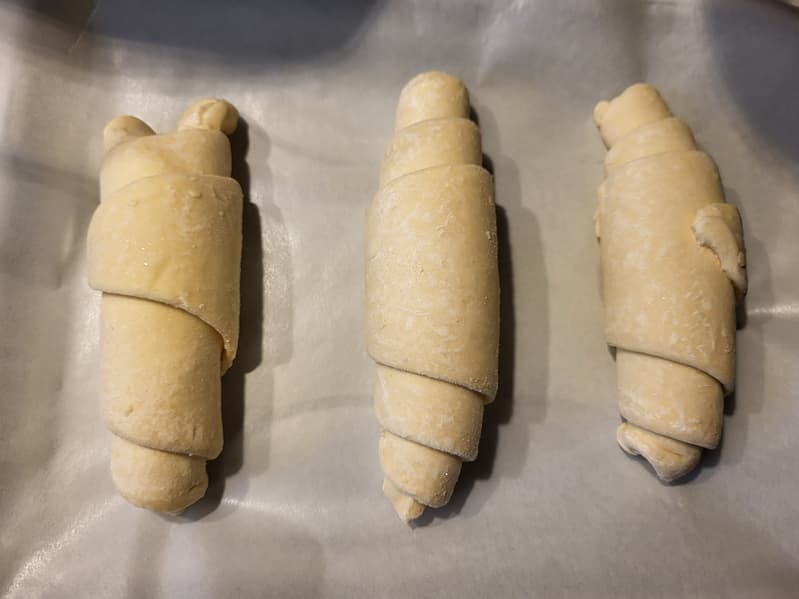 Примерно через час мы отправили их в духовку, выставив 180 °C и поставив время 25 минут. Но тут мы совершили роковую ошибку: поставили противень на верхний уровень и не учли, что круассаны в процессе выпечки будут подниматься.