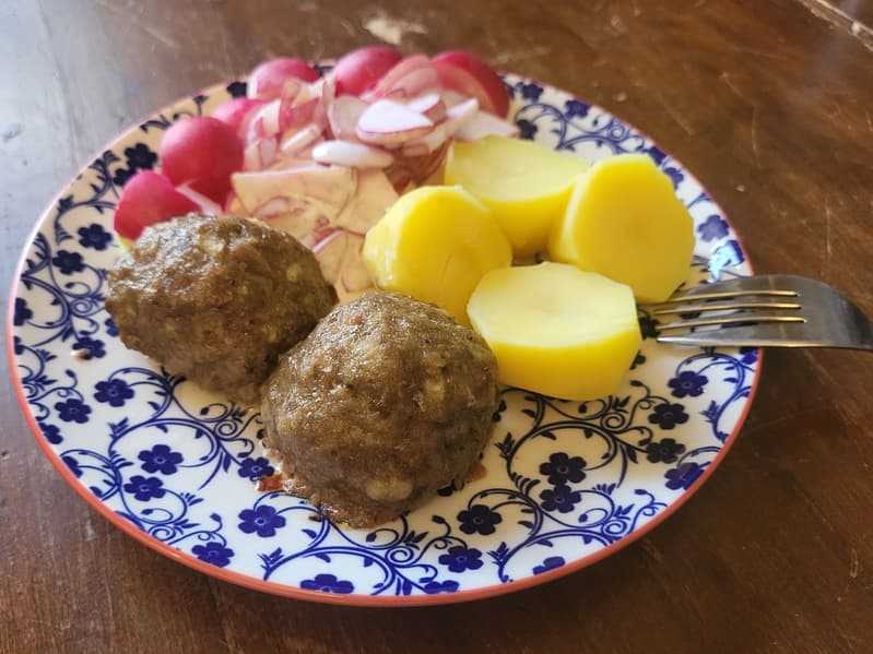 Что, впрочем, совершенно не помешало нам их съесть с вареной картошкой и салатом из редиски.
