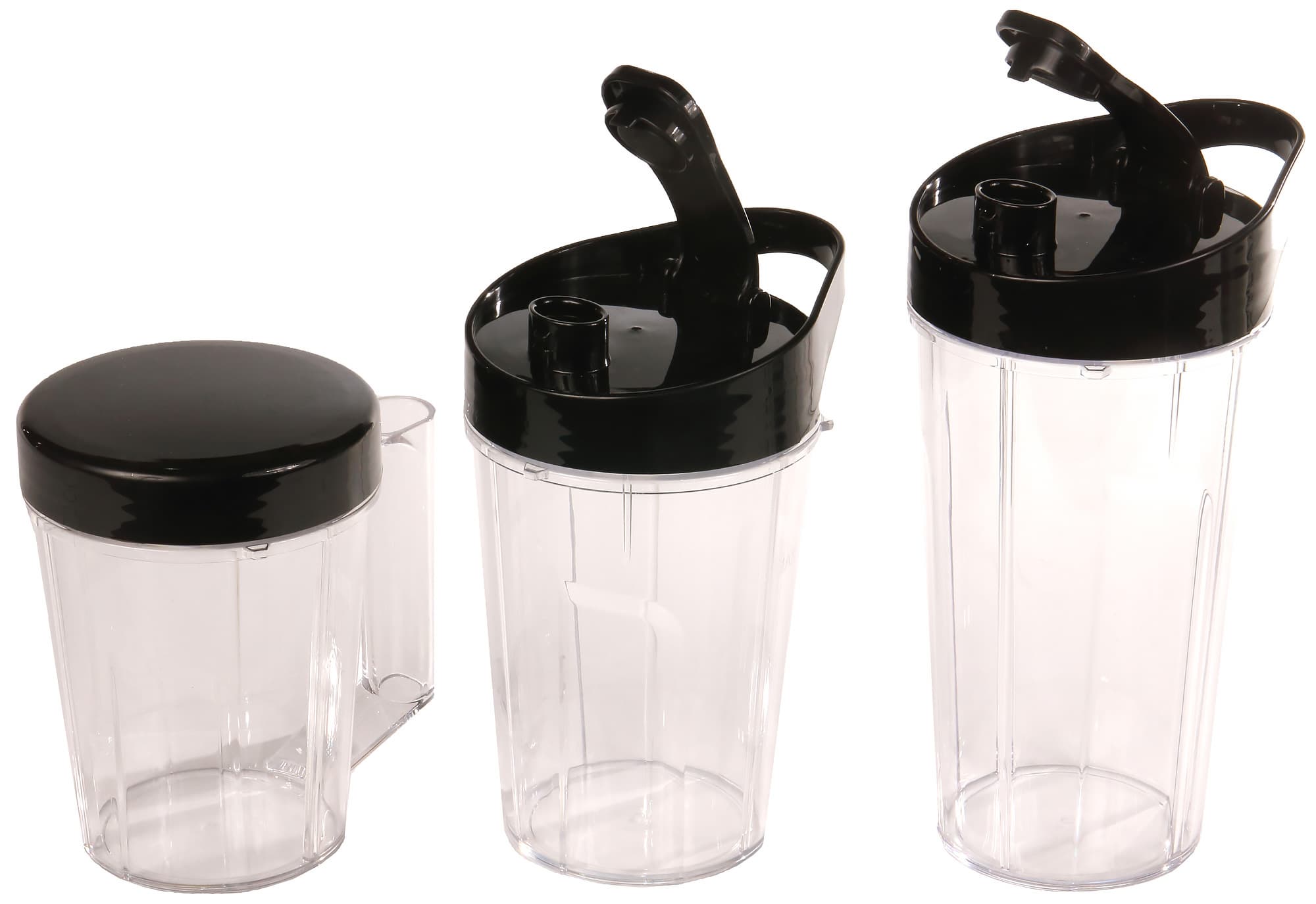 Стаканы сделаны из прозрачного пластика; верхняя часть тоже имеет резьбу для блока с ножом и крышки. Крышек в комплекте три: две из них одинаковые, с закрывающимся клапаном для питья в дороге; эти аксессуары предназначены для двух больших стаканов. Сплошная крышка нужна для чашки на 0,35 л.