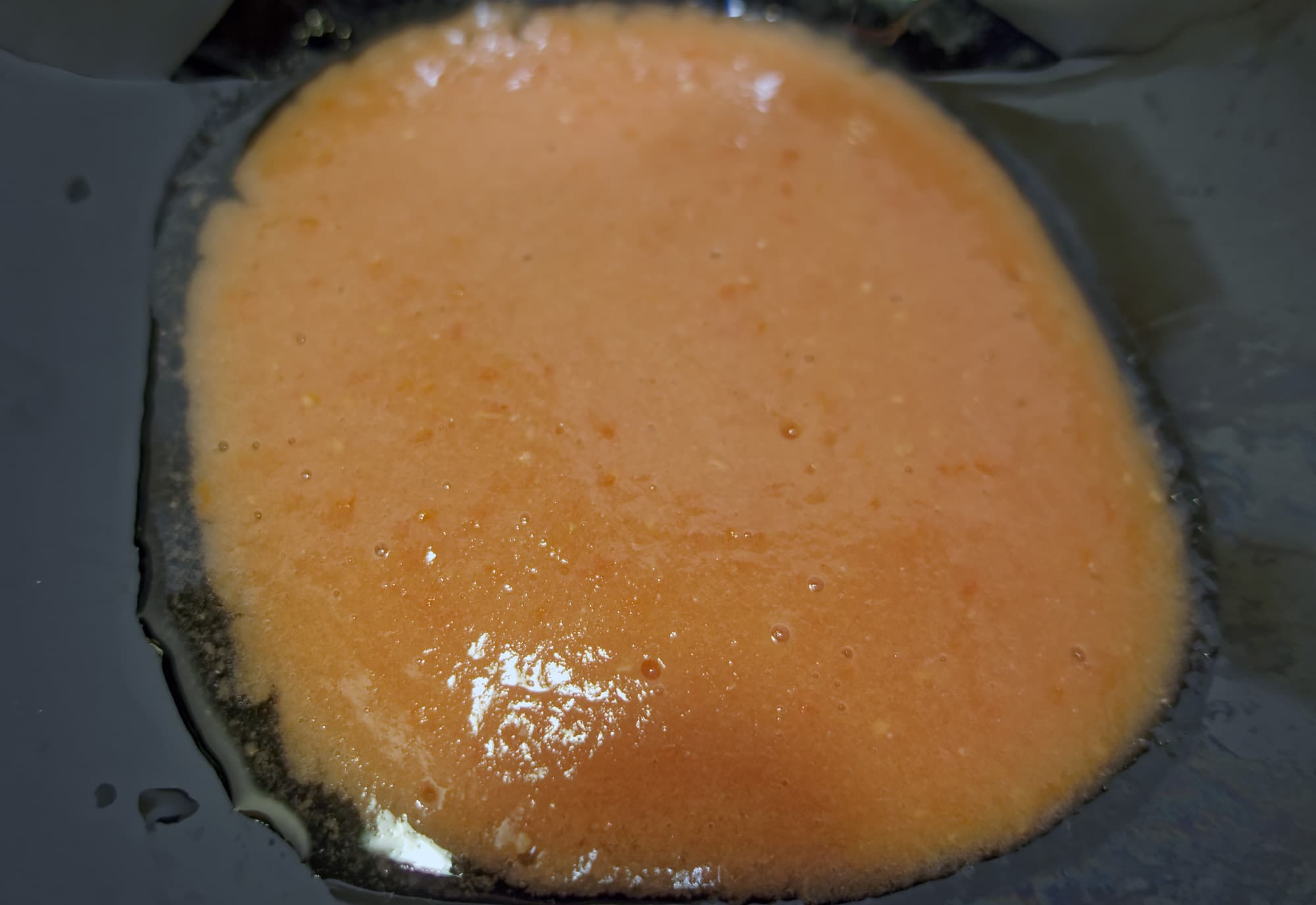Для этого опыта мы взяли 500 г. довольно твердых помидоров, нарезали их небольшими кусками и положили в самый большой стакан. Через 5 секунд работы обычного режима наши куски превратились в жидкую массу. Через минуту после старта сработало автоотключение. Все томаты превратились в гомогенную смесь с едва различимыми вкраплениями кусков шкурки.