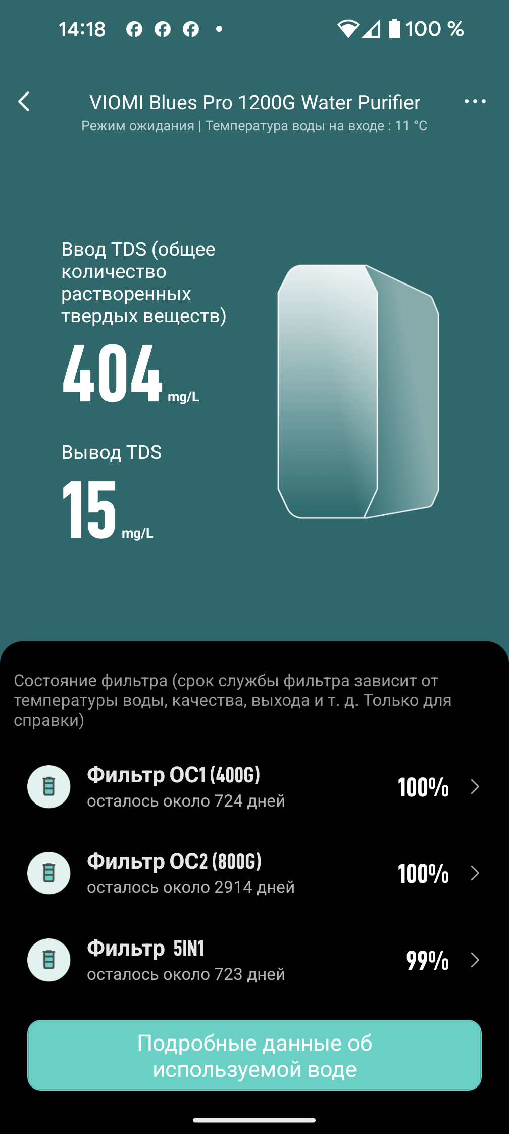 На главном экране приложения отображается ресурс всех трех фильтрующих картриджей в процентах и днях. Информация о времени жизни расходников — вещь сама по себе полезная, но значительно больше нам понравилась возможность воочию убедиться в эффективности устройства: рядом со схематическим изображением программа выводит показания встроенных TDS-метров.