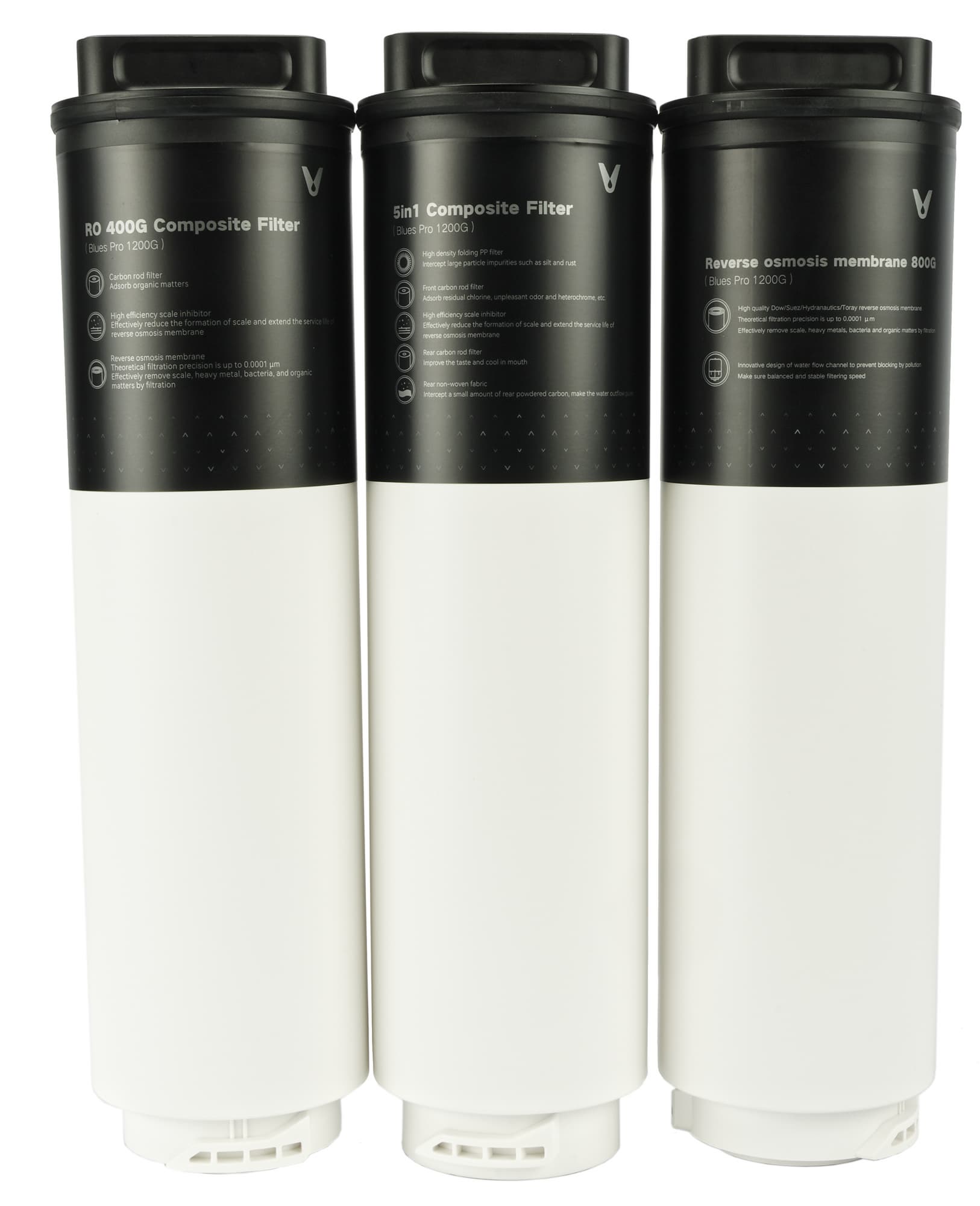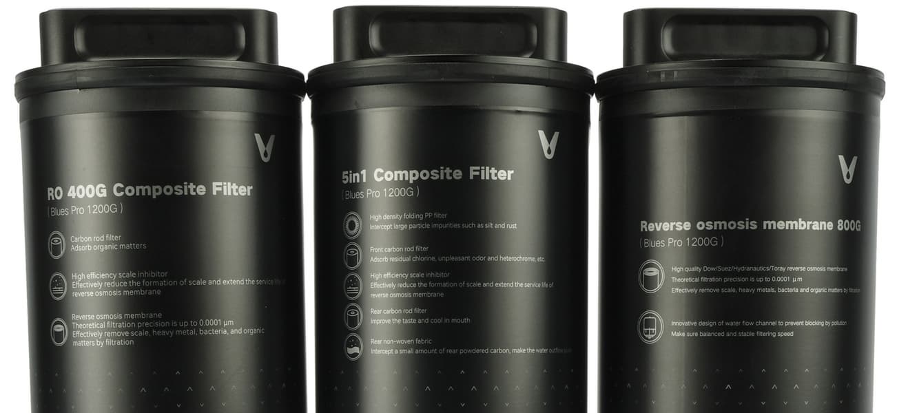 В конструкции Viomi Blues Pro 1200G, как мы уже писали выше, используются три картриджа. На первом этапе поступающая из водопровода жидкость подвергается предварительной очистке с помощью композитного фильтра «5 в 1». Он обеспечивает фильтрацию крупных частиц, таких как налет и ржавчина, поглощение остаточного хлора, запахов и красителей. Ресурс фильтра составляет 7200 литров, что соответствует приблизительно двум годам эксплуатации.