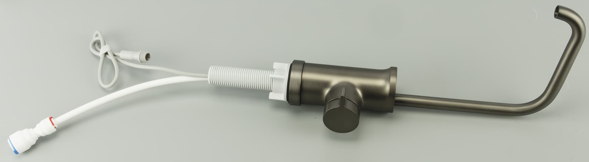 Помимо традиционного водопроводного фитинга, из нижней части крана выходит электропровод с герметичной четырехконтактной розеткой. Он обеспечивает функциональность индикатора на верхнем торце конструкции: мы рассмотрим его подробнее, когда подключим устройство.