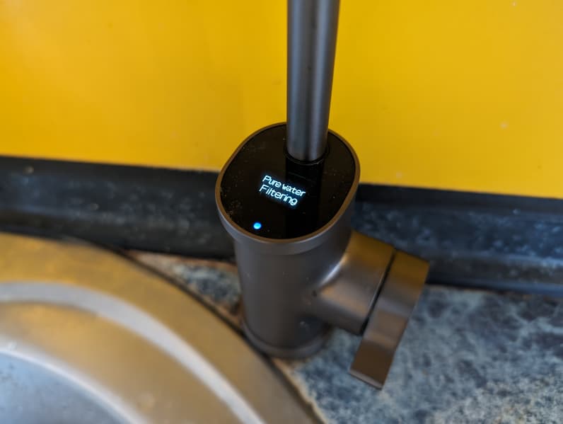 Установка системы завершается инсталляцией крана для чистой воды, который надо подключить не только к пластиковой трубке, но и к интерфейсному кабелю, выходящему из корпуса фильтра. Этот шнур обеспечивает работу небольшого ЖК-экрана, информирующего пользователя о состоянии системы.