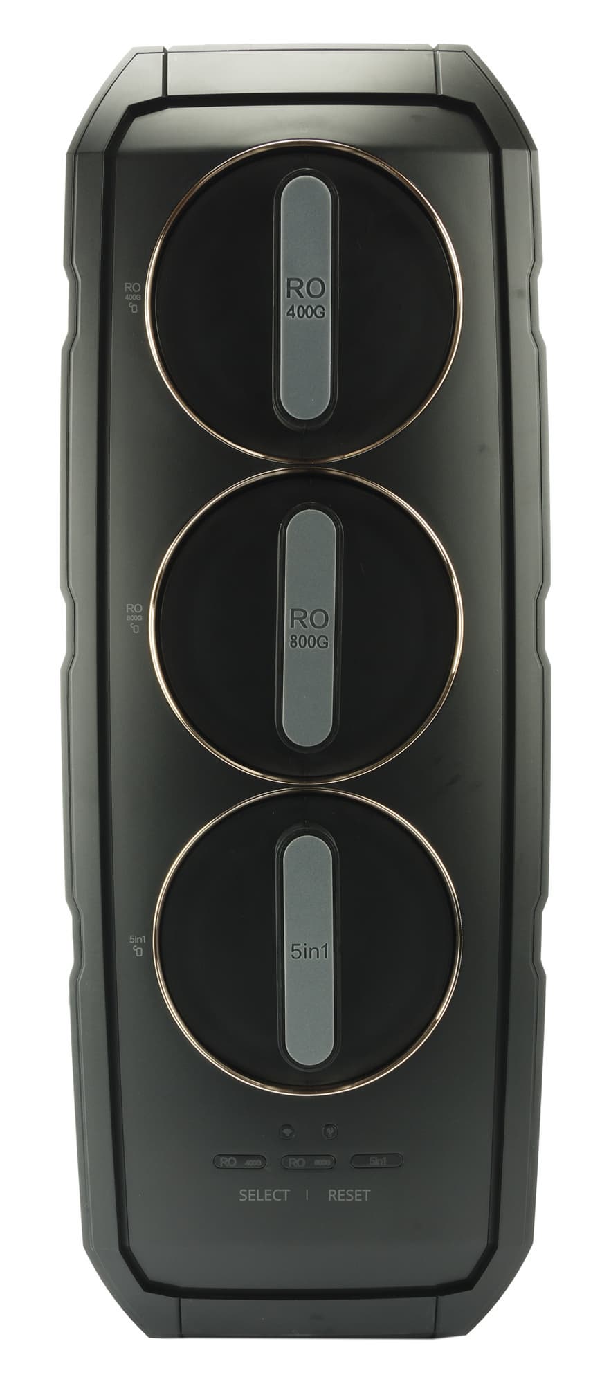 Большую часть передней панели занимают круглые крышки фильтрующих картриджей: их у нашего устройства три. Под ними размещаются три управляющие кнопки.