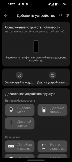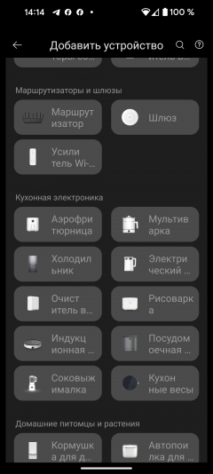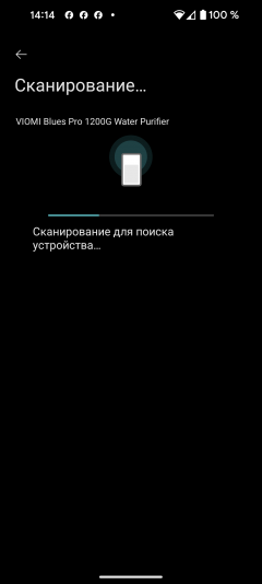 Чтобы начать синхронизацию, необходимо воспользоваться ссылкой «добавить устройство» в верхнем правом углу главного экрана. Автоматическое обнаружение в нашем случае не сработало, поэтому пришлось воспользоваться ручным выбором: Viomi Blues Pro 1200G можно найти в разделе «Кухонная техника»/«Очистители воды».