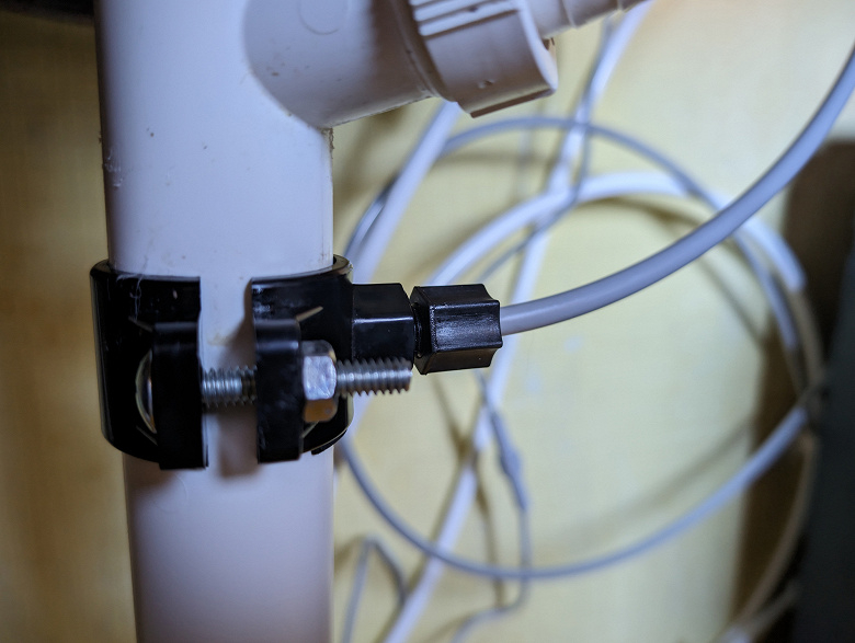 Отработанная вода с осмотического фильтра должна отводиться в канализацию. Для этого в комплекте есть соответствующая пластиковая трубка, а вот хомут, устанавливаемый на фановую трубу, отсутствует — нам пришлось приобрести его отдельно.